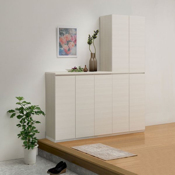 ●玄関収納 幅90cmの下駄箱・シューズラック。ポルターレエントランスシリーズの組み合わせで、玄関をリフォームしたかのような大型エントランス収納にできます。ホワイト 白木目。