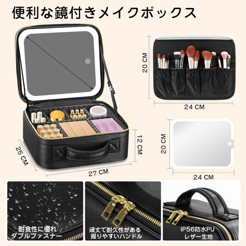 LEDミラー付き 化粧品収納ケース 大容量 自立式 防水PUレザー 3色調光 鏡付き化粧箱 ブラシ収納付き 携帯用