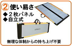【代引支払】はご利用頂けません。 お支払いはクレジットカード払い、または銀行振込をご選択下さい。 代引支払にてご注文を頂いた場合、ご注文をキャンセルとさせて 頂く場合もございますので、ご了承ください。 ************************************************* 安心と使いやすさにスマートさをプラス ・2枚式で自立するから、無理な体制からの持ち上げ不要 ・今まで入らなかった間口にも対応 ・70cmのスマートさにより従来のスロープで入らなかった所へも対応。 ・全てのタイプに高さ2.5cmの脱輪防止エッジあり。 ・幅70cmのスマートデザインスロープ。 ・アルミ製の脱輪防止エッジ付。下端部までエッジが無い為狭い場所での乗り入れが簡単。 ・走行面の視認性を高め安全に走行可。簡単なメンテナンス性。 ・取っ手付。 ・四隅に蛍光テープと反射テープを貼り付けして、夜間の視認性もUP! ※上端が4cm以上(設置位置赤ライン)設置面に掛かっていること、ずれやがたつきが無い事確認してください。 ※設置、収納の際は指などを挟まないよう注意してください。また、ご使用後は屋内で保管してください。
