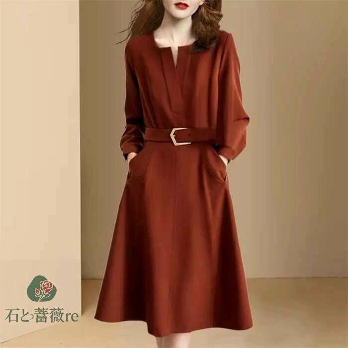 ワンピース ワンピ レディース ロングワンピース フレンチ 長袖 ウエストリボン Vネック プルオーバー 体型カバー 無地 ゆったり シンプル ロングワンピ 大きいサイズ 着・せ レトロ ポケット デザイン感 エレガント 30代 40代 50代 通勤 OL オフィス 送料無料