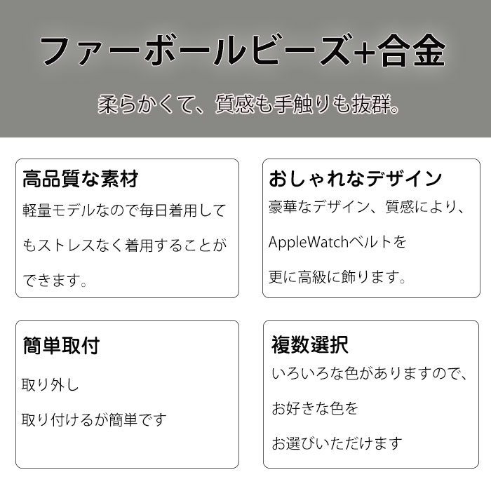 【対応機種】 49mm(Ultra/2/3) 46mm(Series10/11) 42mm(Series10/11) 45mm(Series7/8/9) 41mm(Series7/8/9) 44mm(Series4/5/SE/6/SE2/SE3) 40mm(Series4/5/SE/6/SE2/SE3) 42mm(Series1/2/3) 38mm(Series1/2/3) 素材:ファーボール ビーズ+合金 ・5色のカラーをご用意しておりますので、あなたにピッタリのお色が見つかるはず! ・軽量モデルなので毎日着用してもストレスなく着用することができます。 ・豪華なデザイン、質感により、AppleWatchベルトを更に高級に飾ります。 ・スライダービーズ付きのapple watchバンドは、調整工具不要で、手首のサイズに合わせて長さを簡単に調整できます。 ・出勤、通学、旅行、パーティー、スポーツなどいろいろなシーンにおすすめです! ・アップルウォッチ多機種対応 ・幅広いシーンで活躍するデザイン ※注意事項 ※AppleWatch本体は付属しておりません。 ※商品のお色は撮影時の環境、ディスプレイの発色などにより実物と多少の違いが生じることがございます。予めご了承下さいませ。