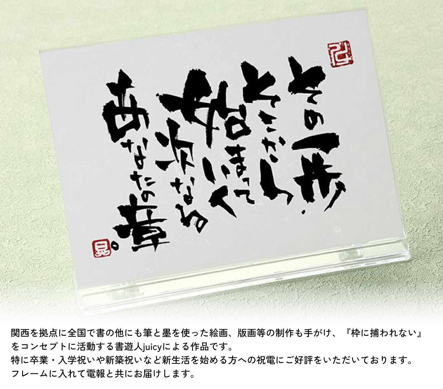 For-Denpoの特徴 For-Denpoは総務省認可の電報サービスです。 沖縄・離島を含む全国に祝電・弔電を即日配送いたします。 文字料金がかからず最大350文字まで(※カードタイプは154文字)入力できるのでご自身の言葉で思いを届けることができます。 結婚式へのお祝い電報や、就任・昇進祝い、誕生日祝いなど様々なシーンに合ったおしゃれで上質な電報を数多く取り揃えております。 また、突然のご訃報に際し、ご葬儀への弔電も承っております。 地域によっては当日中や翌日午前に配送できますので、お気軽にお問い合わせくださいませ。関西を拠点に全国で書の他にも筆と墨を使った絵画、版画等の制作も手がけ、『枠に捕われない』をコンセプトに活動する書遊人juicyによる作品です。 贈るお相手に想いがしっかりと伝わる力強い書のメッセージです。フレームに入れて、電報と共にお届けします。 ご友人やご家族、仕事関係の方まで幅広くお送りいただける祝電です。