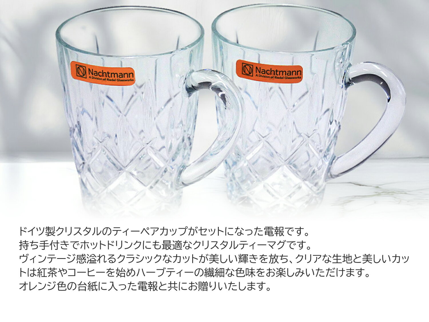 For-Denpoの特徴 For-Denpoは総務省認可の電報サービスです。 沖縄・離島を含む全国に祝電・弔電を即日配送いたします。 文字料金がかからず最大350文字まで(※カードタイプは154文字)入力できるのでご自身の言葉で思いを届けることができます。 結婚式へのお祝い電報や、就任・昇進祝い、誕生日祝いなど様々なシーンに合ったおしゃれで上質な電報を数多く取り揃えております。 また、突然のご訃報に際し、ご葬儀への弔電も承っております。 地域によっては当日中や翌日午前に配送できますので、お気軽にお問い合わせくださいませ。クリスタル ティーマグ お誕生日祝いや結婚式の祝電など、あらゆるお祝いの場面にお贈りいただける電報です。 ドイツ製クリスタルのティーペアカップがセットになった電報です。 持ち手付きでホットドリンクにも最適なクリスタルティーマグです。ヴィンテージ感溢れるクラシックなカットが美しい輝きを放ち、飲み物を注ぐと繊細な色味をお楽しみいただけます。 オレンジ色の台紙の電報と共にお贈りいたします。