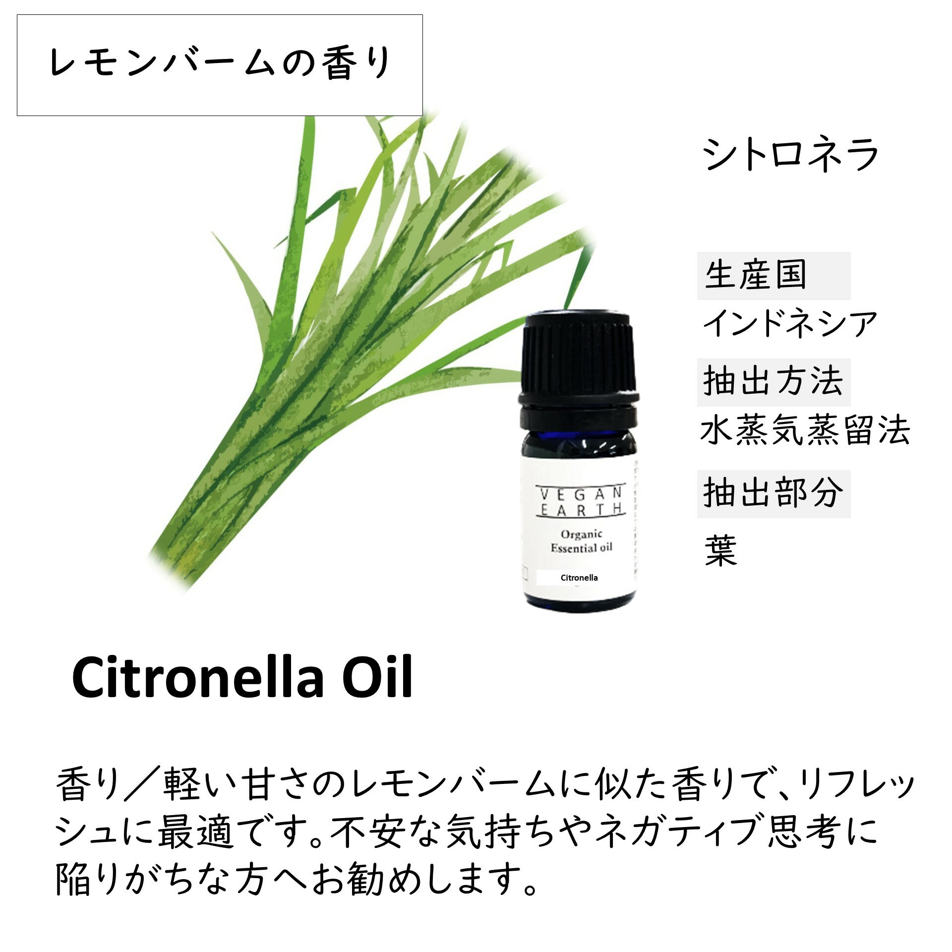 【シトロネラ】 天然100%高級エッセンシャルオイル USDA認証 アロマオイル 天然100% オーガニック ヴィーガン レモンバーム リフレッシュ 明るい 気持ち USDAオーガニック認証の天然植物精油100% 特長】