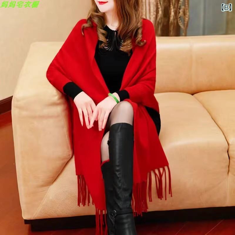 ケープコート レディース 冬 秋 ショール 無地 フリンジ 暖かい 防寒 マント きれいめ シンプル おしゃれ 黒 赤 ワインレッド 普段使い 袖付き 体型カバー