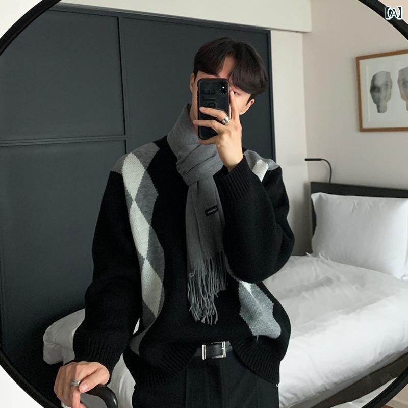 セーター メンズ おしゃれ 秋冬 ランドネック 長袖 ニット プルオーバー カラーブロック カジュアル トップス 菱形柄 上品 普段使い 黒