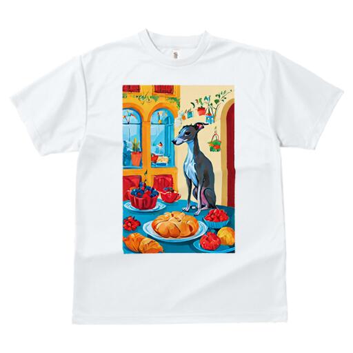 イタリアングレーハウンド Tシャツ 犬愛 ユニークデザインレディース 犬ファン 半袖 春夏 プリント 大人カジュアル かわいい 人間用 ギフト 個性的 猛暑対策 パン イタリアングレーハウンド 窓 鉢植え 果物