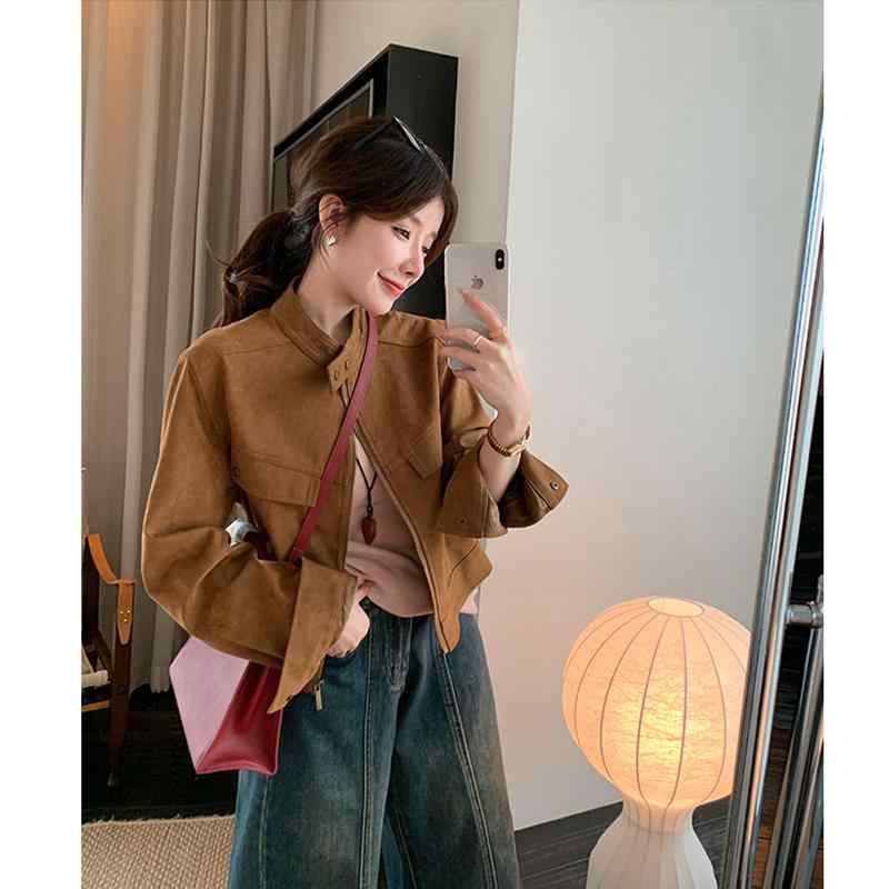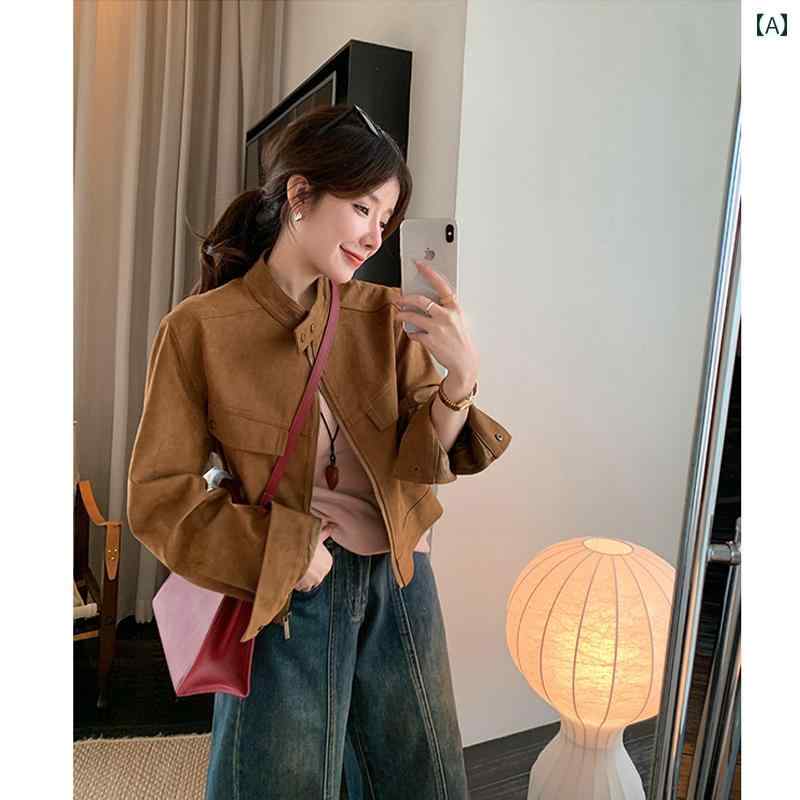 ジャケット レディース おしゃれ ブラウン ショート丈 春秋 鹿革風 スエード ジャケット 小柄 アウター
