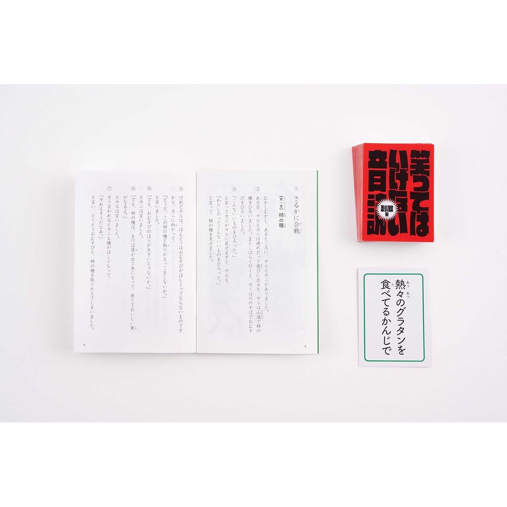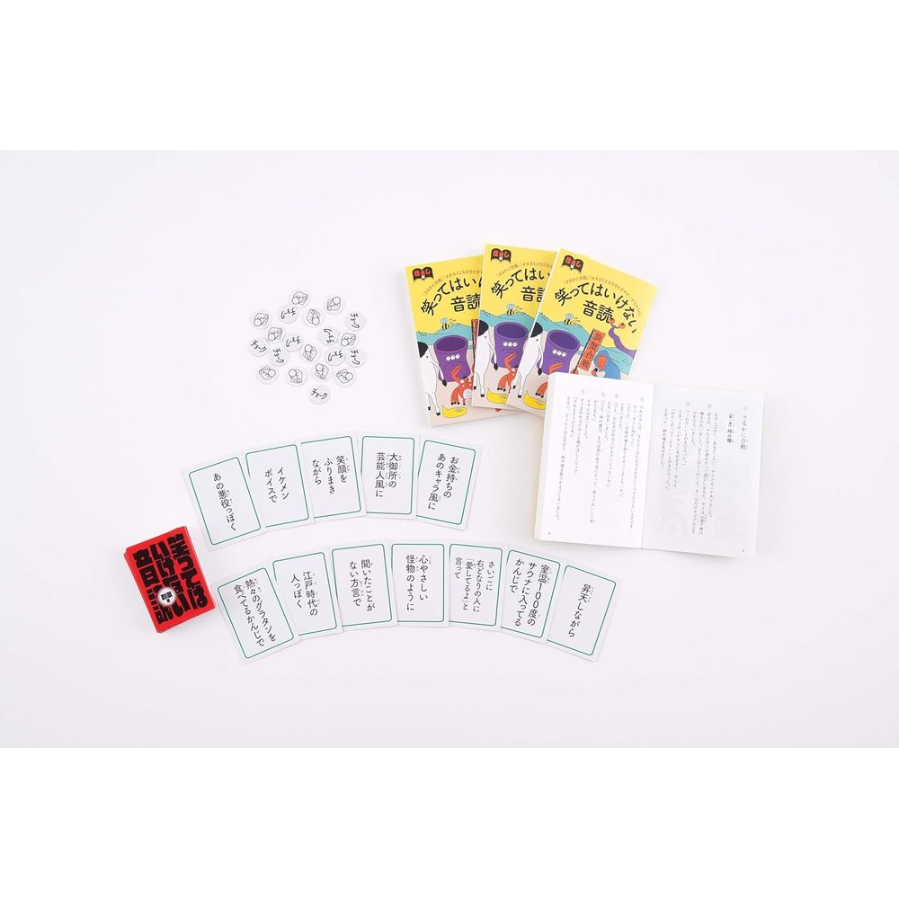 【遊びかた】(1) 教科書の文章を1節ごと順番に読んでいきます。(2) 読み始める前に指示カードを場にオープンし、読み手はそのカードの指示にそって音読をします。ただし、読み手も聞き手も笑ってはいけません。(3) 音読中に笑ってしまったら、チョークチップを取ります。これをくり返し、チップがなくらず最後まで音読ができれば全員勝利! 音読の途中でチップがなくなってしまったら、チップを一番多く持っている人が負け!セット内容: 教科書4冊(52ページ/童話3話収録 「さるかに合戦」「オオカミと七ひきの子ヤギ」「かちかち山」) 指示カード50枚 チョークチップ20枚プレイ人数: 2〜4人/プレイ時間: 約20分対象年齢:8歳以上パッケージサイズ:102×150×28mm(C)NONPRODUCTPRODUCTION,GENTOSHA2024