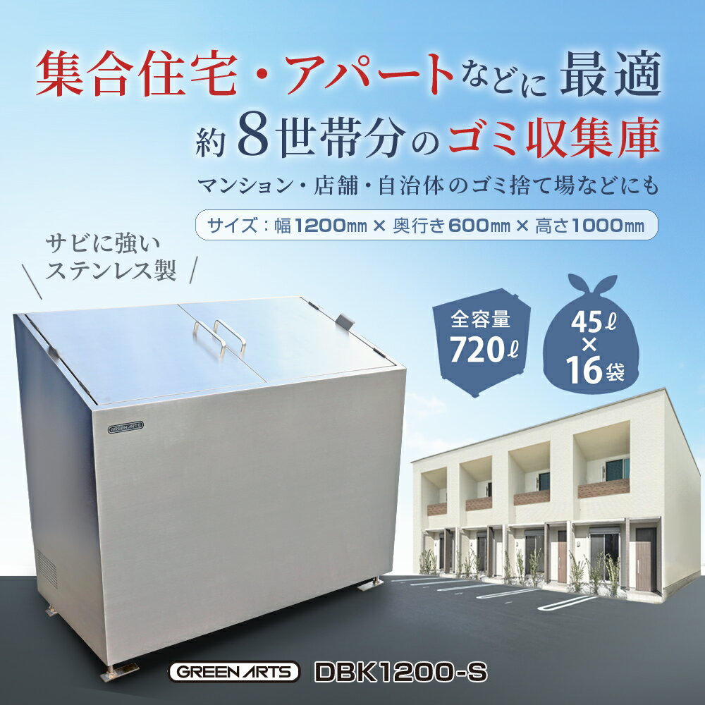 ※ご購入前に必ずご一読下さい。 商 品 ゴミストッカー DBK1200-S 色:ステンレス(シルバー) 材質:ステンレス 容量:720L/ごみ袋(45L)16袋(約8世帯分) 用途:集合住宅地・アパート・ハイツ・マンションのゴミ収集場にゴミステーションとして。業務用のごみ保管としてもご使用できます。 完成品:アンカーのみ組み立て必要 配送:個人宅への配送OK 容量 720リットル: ゴミ袋(45リットル) 約16袋 (約8世帯分) 寸 法 本体寸法 1200×600×1000mm 完成品:アンカーのみ組み立て必要 納 期 入金確認後、当日〜3営業日前後 ※メーカー品のため、お時間がかかる場合がございます。 ご注意 ※ご入金後の変更・キャンセルは基本的にお受け付けできません。 ポイントについて ポイント設定の切り替えタイミングによっては、倍率アップとならない時間帯が発生いたします。購入時点の各商品ページのポイント倍率を必ずご確認の上、ご購入ください。(後から付与は出来かねます。)↓こちらもお勧め!大容量720L、機能性かつ美しさのDBK1200↓