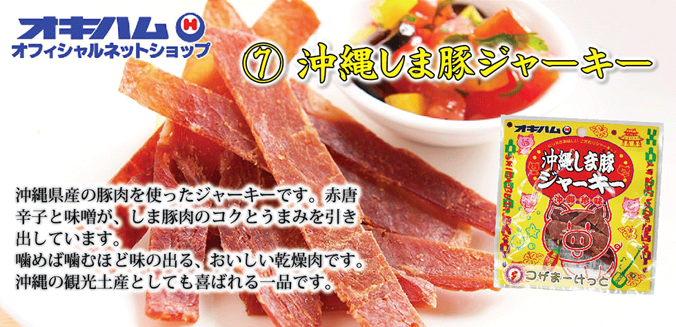 ■商品特徴:沖縄県産の豚肉を使ったジャーキーです。赤唐辛子と味噌がしま豚肉のコクとうまみを引き出しています。おやつやビールのおつまみに。