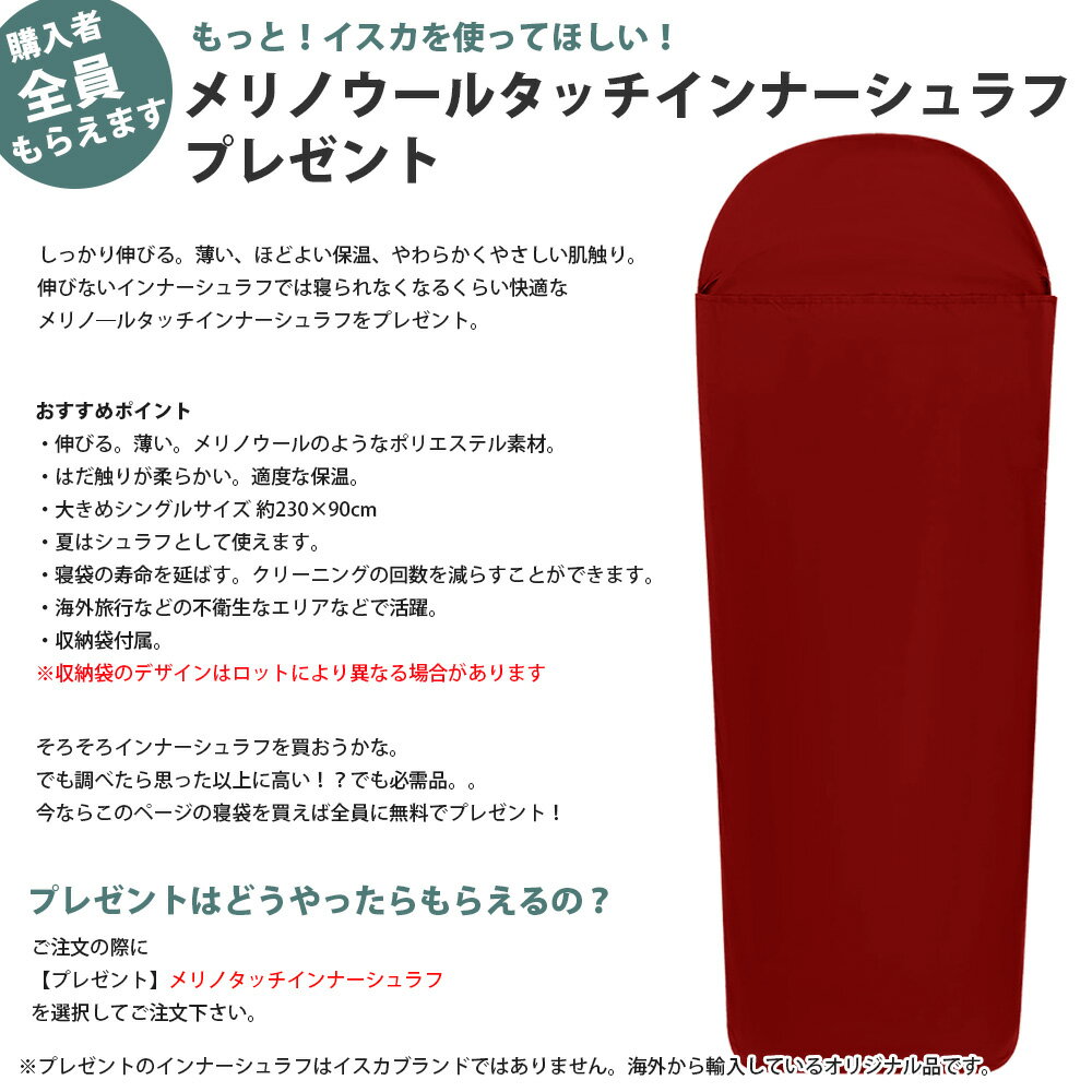 もっと!イスカを使ってほしい! メリノウールタッチインナーシュラフプレゼント しっかり伸びる。薄い、ほどよい保温、やわらかくやさしい肌触り。 伸びないインナーシュラフでは寝られなくなるくらい快適な メリノ—ルタッチインナーシュラフをプレゼント。 おすすめポイント ・伸びる。薄い。メリノウールのようなポリエステル素材。 ・はだ触りが柔らかい。適度な保温。 ・大きめシングルサイズ 約230×90cm ・夏はシュラフとして使えます。 ・寝袋の寿命を延ばす。クリーニングの回数を減らすことができます。 ・海外旅行などの不衛生なエリアなどで活躍。 ・収納袋付属。 そろそろインナーシュラフを買おうかな。 でも調べたら思った以上に高い!?でも必需品。。 今ならこのページの寝袋を買えば全員に無料でプレゼント! ご注文の際に