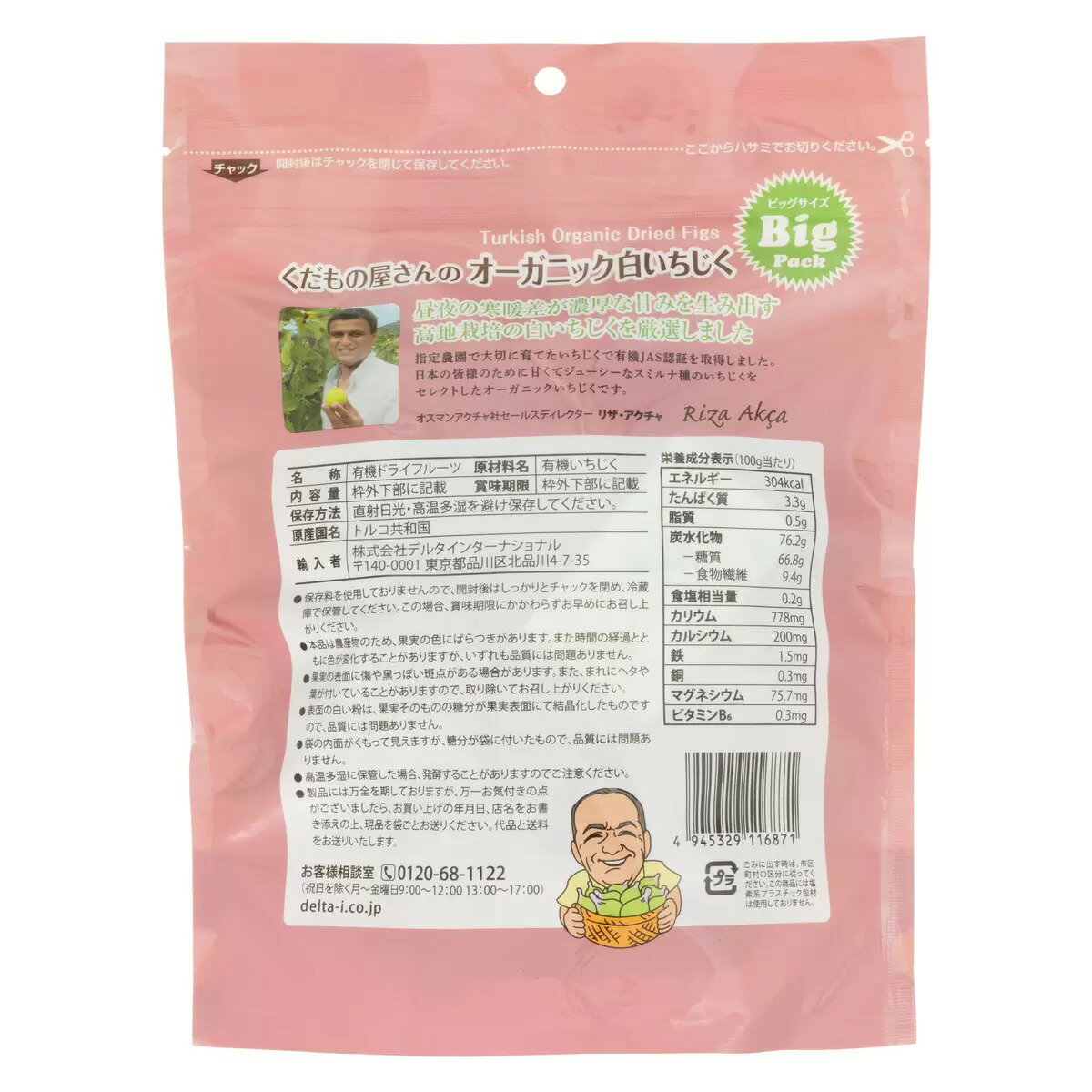 【620g】デルタインターナショナル オーガニック白いちじく 620g トルコ産 ドライいちじく 無添加 濃厚な甘み ふっくら柔らか食感 有機栽培 ドライフルーツ 大容量 おやつ 製菓材料 大容量620gで家族みんなでおやつに、ヨーグルトに、製菓材料に。使い勝手抜群のオーガニック白いちじく。 トルコ産の完熟いちじくを有機栽培で育て、自然の甘さと柔らかな食感をそのまま閉じ込めた「オーガニック白いちじく 620g」です。砂糖・保存料・着色料などの添加物を一切使用していないため、子どもから大人まで安心してお召し上がりいただけます。白いちじく特有の濃厚なコクと蜜のような甘み、そしてふっくら柔らかな果肉が特徴。そのままおやつとしてはもちろん、ヨーグルト・シリアル・サラダ・チーズとの相性も抜群。製菓材料としても幅広く活躍します。大容量620gパックなので、日々のおやつやストック食材としても使い勝手◎。自然派志向の方や、ヘルシースナックをお探しの方にぴったりのオーガニックドライフルーツです。 5