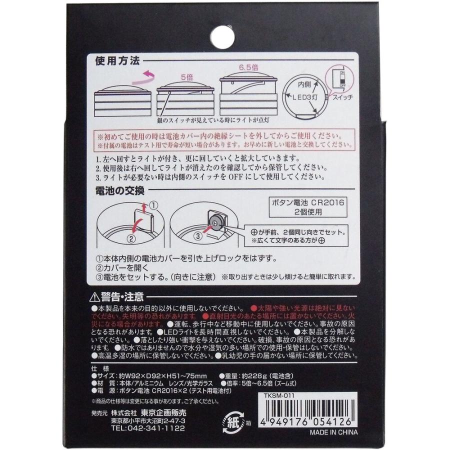 ズームとライトでとっても見やすい!倍率が変わる拡大ズーム付き!明るく見やすいLED付き!光学ガラスレンズ使用でくっきりよく見える。本体は高級感のあるアルミダイキャストを使用。収納ケース付き。机上等に常備、重しとして。読書など長時間使用向き。ズーム機能5〜6.5倍。本体サイズ:約幅92×高さ51〜75×奥行92mm本体重量:約228g(電池含)本体:アルミニウムレンズ:光学ガラス