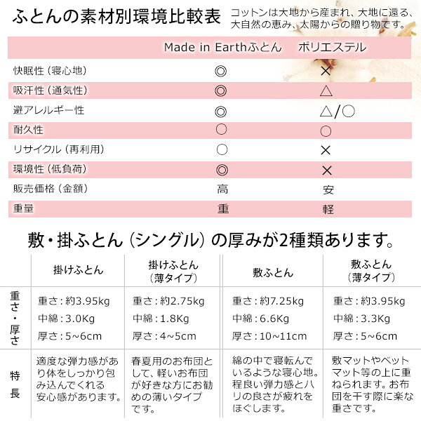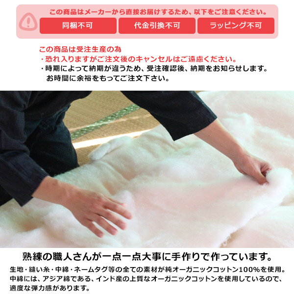 商品番号 / 型番:50-220-01-S / OFS101ブランド名:メイドインアース商品名:オーガニックコットン 大人用ふとん掛敷セット シングルオーガニックコットン 大人用ふとん掛敷セット シングル 現在の納期状況 ご注文より2〜3か月 メイド・イン・アースのオーガニックコットン 大人用ふとん掛敷セット シングルです。 「寝具製作技能士」の国家資格を持った熟練の職人さんが1つ1つ丁寧に手作りした、最上級な仕立ての掛・敷ふとんのシングルサイズのセット。 生地・中綿・縫製糸・ネームタグなど全てオーガニックコットンを使用するこだわりです。 綿100%なので、吸湿性・保温性が高く、適度な弾力がからだを包み込むような安心感があります。 敏感肌の方も安心して、自然のぬくもりとやさしさを感じることができるお布団です。 数年後、ふんわり感が減ってきたと感じたら、打ち直しをすることもできるので環境にもやさしいですね。 ※ご注文後の製作になるため、メーカー直送とさせて頂いております。 ・ご注文状況により納期が異なるため、確認後に納期をお知らせします。 ・メーカー直送のため、他商品の同梱不可。 ・代金引換・ラッピング不可。 ・ご注文確定後のキャンセル・返品は承れません。予めご了承下さい。 離島への配送は、別途「離島料金」が発生する場合がございます。 システムの都合上、ご注文いただいたタイミングでは送料無料と表記されております。 ご注文確認後改めてご連絡いたします。 サイズ 掛ふとん:150×210 厚み5~6cm 重さ3.95kg(中綿3.0kg) 敷ふとん:100×210 厚み10~11cm 重さ7.25kg(中綿6.6kg) 素材生地・中綿:オーガニックコットン100%・平織 カラー生成 原産国日本 オーガニックコットンお布団のお取り扱いについて