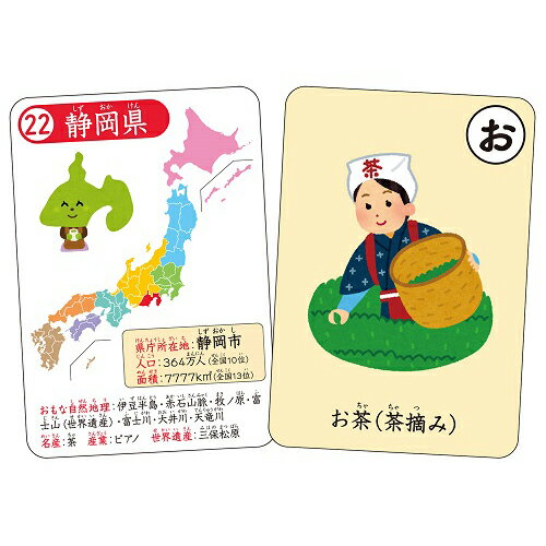 【楽しく覚える! 都道府県 かるた】 都道府県をテーマにした、読み上げかるた。楽しく学びながら、都道府県を学びましょう! 札の内容を、モジュール機が読み上げます。毎回ちがう順番で札を読み上げるシャッフル機能!! 札の裏面には都道府県の位置地図、県庁所在地・面積・人口、主な自然地理、名産・特産品/名所などの情報が盛りだくさん。 日本地図都道府県ポスター (B4サイズ) が付いていて、 都道府県庁所在地も学習できます。小学生の社会科学習にも最適です。 「いらすとや」さんのイラストを特別に使用!!!