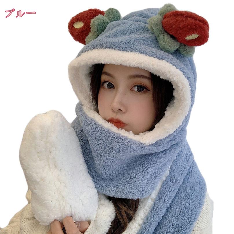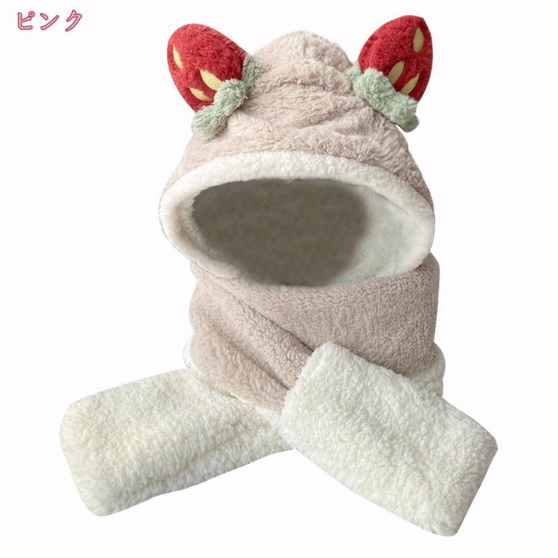 1000円OFFクーポン マフラー 苺柄 帽子 レディース ポンポン 大きいサイズ 耳あて付 かわいい もこもこ 防寒 ケーブル編み おしゃれ 小顔効果 秋冬 暖かい 3点一体化 あたたかい 防寒 保温 冬用 裏起毛 フード付きスヌード マフラー holosbird-goods1