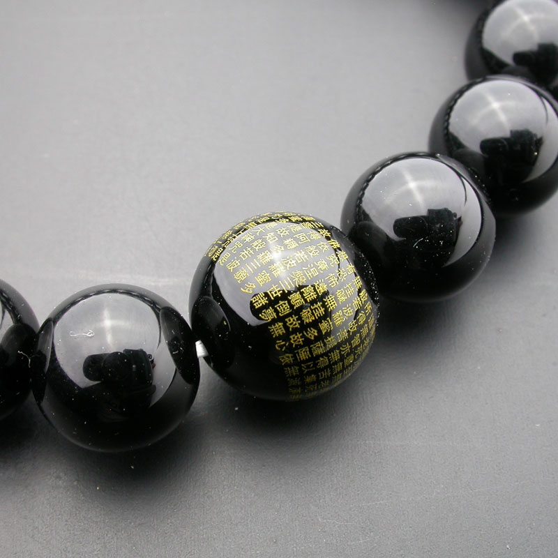 般若心経を彫り込んだオニキスの数珠ブレスレットです。数珠は古代インドのバラモン教で用いられていた道具が原型と言われており、その後中国に伝わり、日本へは飛鳥時代に仏教伝来と共に伝わったと言われております。般若心経が彫られた珠は直径12ミリ、その他の球は直径約10ミリです。オニキスには邪念や悪い気を払う力があると言われ、古くから 魔除けや戦いの護符として使われておりました。 またオニキスを使用したリングやペンダントも多くファッション アイテムとしても人気があります。 ブレスコードには耐久性に優れたウレタンゴムを使用しており、それを3重にすることにより、ゴム切れ時に珠がバラバラにならないように配慮してあります。 ※ こちらの商品はご注文いただいてからの製作となりますので、お届けまで約3〜5週間程お時間を頂戴いたします。予めご了承下さいませ。 お使いになる前にこちらをお読み下さい オニキスは非常にデリケートな石ですので、ぶつけたり、落としたり、強い衝撃を与えたり、急な温度変化があった場合に割れたり、ひびが入ることがございます。 ブレスを着けたままの入浴、スポーツなどはご遠慮下さい。 汚れた場合は柔らかい布などで優しくふき取って下さい。 アルコールやベンジン等の溶剤のご使用はおやめ下さい。