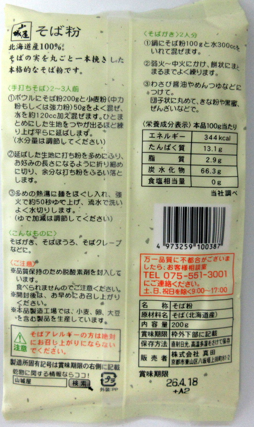 山城屋 北海道産 そば粉 200×2個 京都市 真田 蕎麦粉 一本挽き そば粉 【ポスト投函】