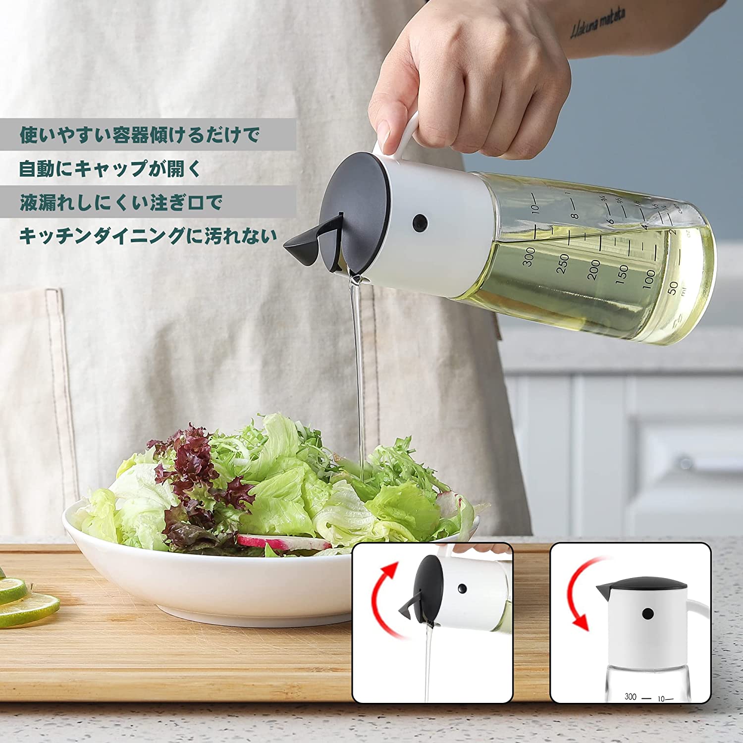【スマートオートマチックキャップデザイン】オイルボトル 液だれしない醤油差しの重力フリップキャップは、ボトルを傾けると自動的に開き、直立すると閉じ、片手で簡単に注ぐことができます。 キャップの内側にシリコンシールガスケットが付いており、油がスムーズにパイプに流れ込み、液漏れを防ぎます。オイルボトルを使用する場合、キャップを外すのは面倒です。キッチンはいつも散らかっていて、うまく調理できません このスマートオイルボトルは親指で押す必要もなく、毎回完璧に注ぐことができ、汚れません。 キャップを自動で閉めることで、余分な酸素が入りにくく、油や調味料の酸化・劣化を抑え、鮮度を長持ちさせます。