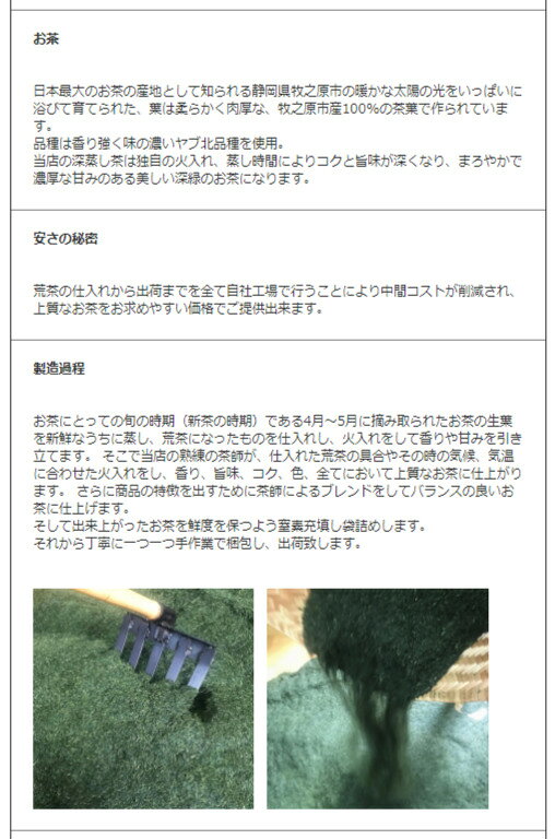 【おすすめの淹れ方】茶葉は6gほど湯冷まししたお湯をいれてふたをしてゆっくり40秒ほど蒸らします。2煎目以降は湯ざましなしで蒸らし時間も10秒ほどで十分です名称深蒸し煎茶 セット原材料名緑茶(静岡県産)内容量深蒸し煎茶 90g 5袋賞味期限製造日より1年間保存方法直射日光・高温多湿を避けて保存してください。製造出荷元 株式会社岩崎恭三商店静岡市葵区平和1-3-54TEL:054-271-2788FAX:054-273-1079