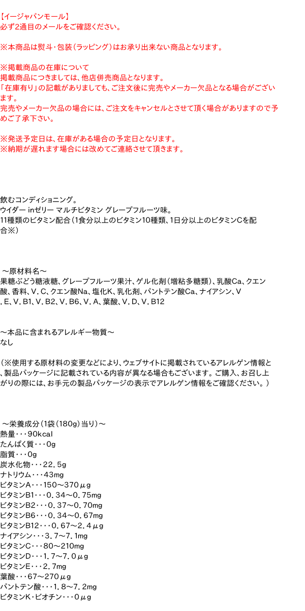 【イージャパンモール】 必ず2通目のメールをご確認ください。 ※本商品は熨斗・包装(ラッピング)はお承り出来ない商品となります。※商品はご注文(ご決済)後、5-7営業日で発送(土・日・祝日除く)となります。※配送業者と契約がないため、送付先が北海道・沖縄・離島の場合キャンセルとさせていただきます。※送付先が東北の場合別途300円の送料を加算させていただきます。※掲載商品の在庫について 掲載商品につきましては、他店併売商品となります。 「在庫有り」の記載がありましても、ご注文後に完売やメーカー欠品となる場合がございます。 完売やメーカー欠品の場合には、ご注文をキャンセルとさせて頂く場合がありますので予めご了承下さい。 ※発送予定日は、在庫がある場合の予定日となります。 ※納期が遅れます場合には改めてご連絡させて頂きます。飲むコンディショニング。 ウイダー inゼリー マルチビタミン グレープフルーツ味。 11種類のビタミン配合(1食分以上のビタミン10種類、1日分以上のビタミンCを配合※) 〜原材料名〜 果糖ぶどう糖液糖、グレープフルーツ果汁、ゲル化剤(増粘多糖類)、乳酸Ca、クエン酸、香料、V.C、クエン酸Na、塩化K、乳化剤、パントテン酸Ca、ナイアシン、V.E、V.B1、V.B2、V.B6、V.A、葉酸、V.D、V.B12 〜本品に含まれるアレルギー物質〜 なし (※使用する原材料の変更などにより、ウェブサイトに掲載されているアレルゲン情報と、製品パッケージに記載されている内容が異なる場合もございます。 ご購入、お召し上がりの際には、お手元の製品パッケージの表示でアレルゲン情報をご確認ください。 ) 〜栄養成分(1袋(180g)当り)〜 熱量・・・90kcal たんぱく質・・・0g 脂質・・・0g 炭水化物・・・22.5g ナトリウム・・・43mg ビタミンA・・・150〜370μg ビタミンB1・・・0.34〜0.75mg ビタミンB2・・・0.37〜0.70mg ビタミンB6・・・0.34〜0.67mg ビタミンB12・・・0.67〜2.4μg ナイアシン・・・3.7〜7.1mg ビタミンC・・・80〜210mg ビタミンD・・・1.7〜7.0μg ビタミンE・・・2.7mg 葉酸・・・67〜270μg パントテン酸・・・1.8〜7.2mg ビタミンK・ビオチン・・・0μg 180g×36個