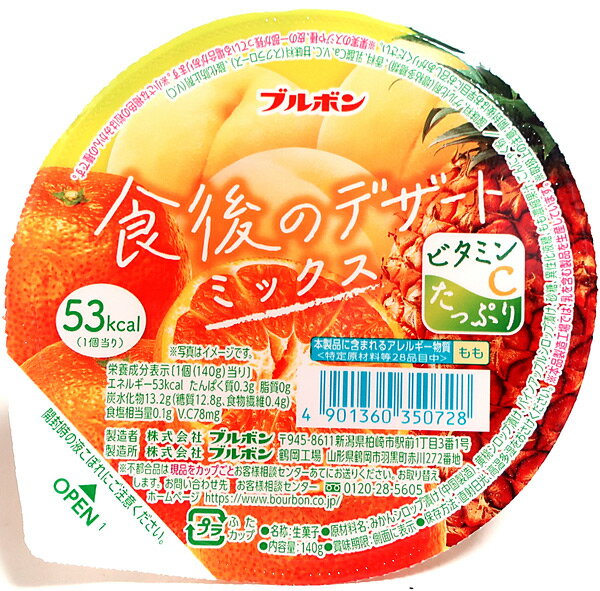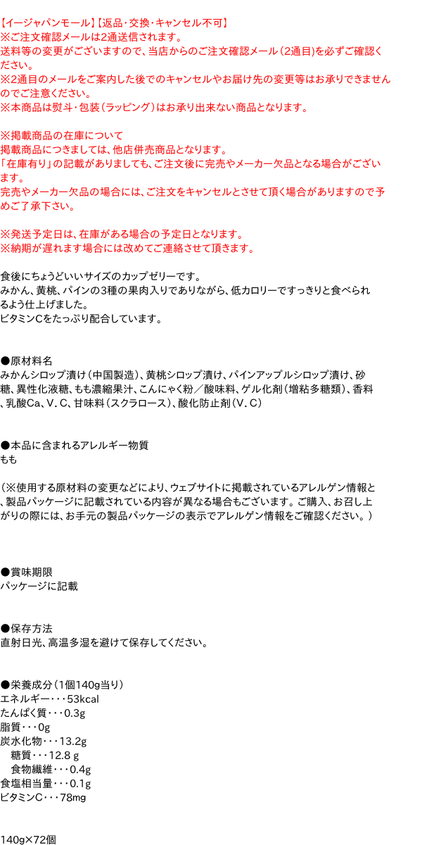 【返品・交換・キャンセル不可】 ※ご注文確認メールは2通送信されます。 送料等の変更がございますので、当店からのご注文確認メール(2通目)を必ずご確認ください。 ※2通目のメールをご案内した後でのキャンセルやお届け先の変更等はお承りできませんのでご注意ください。 ※本商品は熨斗・包装(ラッピング)はお承り出来ない商品となります。※商品はご注文(ご決済)後、3-5営業日で発送(土・日・祝日除く)となります。※配送業者と契約がないため、送付先が北海道・沖縄・離島の場合キャンセルとさせていただきます。※送付先が東北の場合別途300円の送料を加算させていただきます。※掲載商品の在庫について 掲載商品につきましては、他店併売商品となります。 「在庫有り」の記載がありましても、ご注文後に完売やメーカー欠品となる場合がございます。 完売やメーカー欠品の場合には、ご注文をキャンセルとさせて頂く場合がありますので予めご了承下さい。 ※発送予定日は、在庫がある場合の予定日となります。 ※納期が遅れます場合には改めてご連絡させて頂きます。食後にちょうどいいサイズのカップゼリーです。 みかん、黄桃、パインの3種の果肉入りでありながら、低カロリーですっきりと食べられるよう仕上げました。 ビタミンCをたっぷり配合しています。
