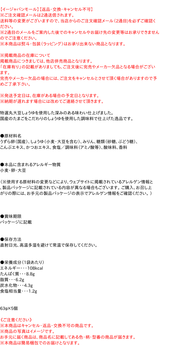 【返品・交換・キャンセル不可】 ※ご注文確認メールは2通送信されます。 送料等の変更がございますので、当店からのご注文確認メール(2通目)を必ずご確認ください。 ※2通目のメールをご案内した後でのキャンセルやお届け先の変更等はお承りできませんのでご注意ください。 ※本商品は熨斗・包装(ラッピング)はお承り出来ない商品となります。※商品はご注文(ご決済)後、10営業日後で発送(土・日・祝日除く)となります。※配送業者と契約がないため、送付先が北海道・沖縄・離島の場合キャンセルとさせていただきます。※掲載商品の在庫について 掲載商品につきましては、他店併売商品となります。 「在庫有り」の記載がありましても、ご注文後に完売やメーカー欠品となる場合がございます。 完売やメーカー欠品の場合には、ご注文をキャンセルとさせて頂く場合がありますので予めご了承下さい。 ※発送予定日は、在庫がある場合の予定日となります。 ※納期が遅れます場合には改めてご連絡させて頂きます。特選丸大豆しょうゆを使用した深みのある味わい仕上げました。 国産のたまごをこだわりのしょうゆを使用した調味料で仕上げた逸品です。