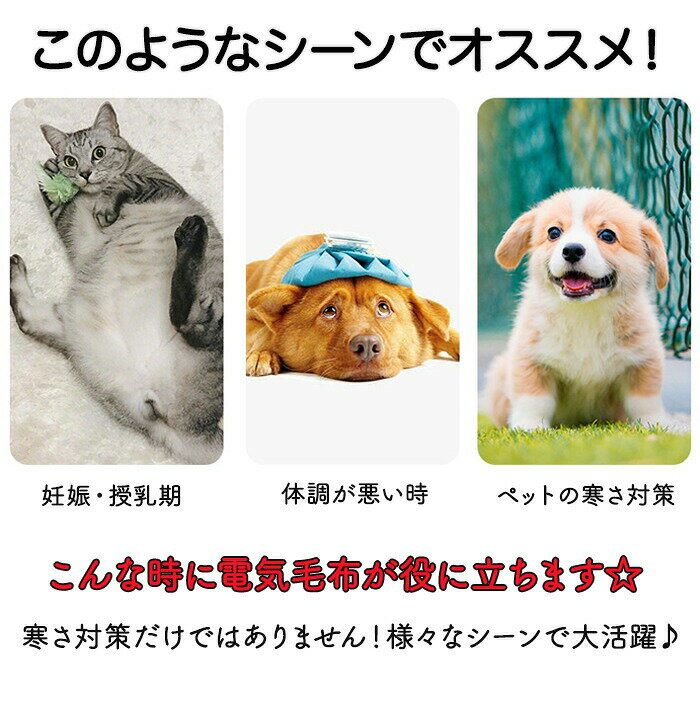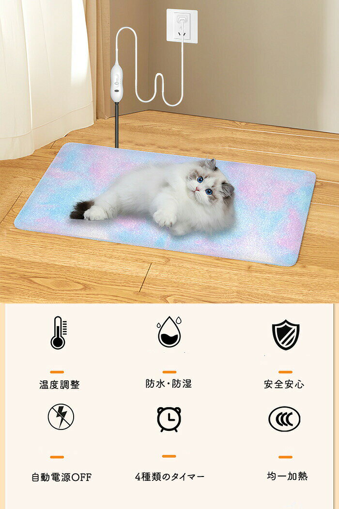 【カバー取り外し可能で洗える】カバーは取り外し可能で洗濯できます。なので汚れ・匂いが気になっても安心!注意事項1. 外出するとき、または目を離すとき、火災ややけどの危険を防ぐため、必ずホットカーペットの電源を切ってください2. ホットカーペットを長時間使用する場合は、低温設定に調整してください。3. 柔らかすぎるベッドやソファの上でホットカーペットを使用しないでください。4. 電源が入っているときは、折り曲げたり丸めたりしないでください!使用しないときは、必ずプラグを抜いてください。5. 鋭利なものでホットカーペットの表面を傷つけないでください。6. 許可なく本製を分解したり、ピンなどを挿入しないでください。7. 本製品を使用する際、分厚い布団や重い断熱材で覆うことは禁止されています。8. ホットカーペット本体は洗えません。汚れた場合は、電源を切ってから濡れたタオルなどで拭き、換気の良いところで乾燥させてください。カバーを付けて使用した場合、カバーは汚れても取り外して洗うことができます。9.濡れた状態で使用しないでください。10.子供や高齢者は、監督なしで使用しないでください。危険を避けるために、上記の注意事項に従ってご使用ください。購入前のご注意※商品写真はできる限り実物と近づけるようにしておりますが、お使いのモニター設定、お部屋の照明等により実際の商品と色味が異なる場合がございます。※採寸はあくまで目安としてのもので、表記に多少の誤差(前後2?3cm)が生じる場合があります。※生産時期により、色・サイズ・デザインが多少が異なる場合がございますので、複数の商品をご注文頂いた場合も多少に異なる場合があります。※当店の商品は全て日本人スタッフにより検品してから発送したものです。海外からの輸入商品のため、縫製は日本製のものと比べて、 縫製の見劣、糸のほつれ、製造過程における小さなキズ、シミなどがある場合がございますが、不良品ではございません。予めご了承くださいませ。※各商品は各商品ページ選択肢のところに規定ある納期より発送いたします。当店では複数店舗で在庫を共有しており、システムによる在庫調整を行っております。ご注文が集中した場合、タイミングにより在庫にずれが生じ欠品となる可能性がございます。 その際、当店での注文確認後にご案内させていただく場合がございますこと、予めご了承ください。商品の保証初期不良の場合、未使用の商品のみ到着日から7日以内にご連絡いただければご返金、交換対応させていただきます。ご使用後の返金・交換は保証外となっております。 ペット用ホットカーペット ホットカーペット ヒーター 暖かヒーター あったかい 寒さ対策 防寒対策 猫 犬 ペット ホットマット あったかグッズ 暖房器具 電気ホットマット 安全 様々な場所で使える 持ち運べる フリース 柔らかい 9段階温度調整 温度調整. 均一保温 防水 防湿 4種類タイマー 自動電源オフ カバー洗えるペット用ホットカーペット ホットカーペット ヒーター ペット用 9段階温度調整 均一保温 あったかい 防寒対策 猫 犬 ペット ホットマット 加熱パッド 電気ヒーター ホットマット 安全 フリース 柔らかい 防水 防湿 自動電源オフ 洗える あったかグッズ 室内 暖房器具 ペット用ホットカーペット防寒対策 電気ホットマットフリース素材9段階温度調整温度調整均一保温防水・防湿 寒さ対策4種類タイマー自動電源オフカバー洗える