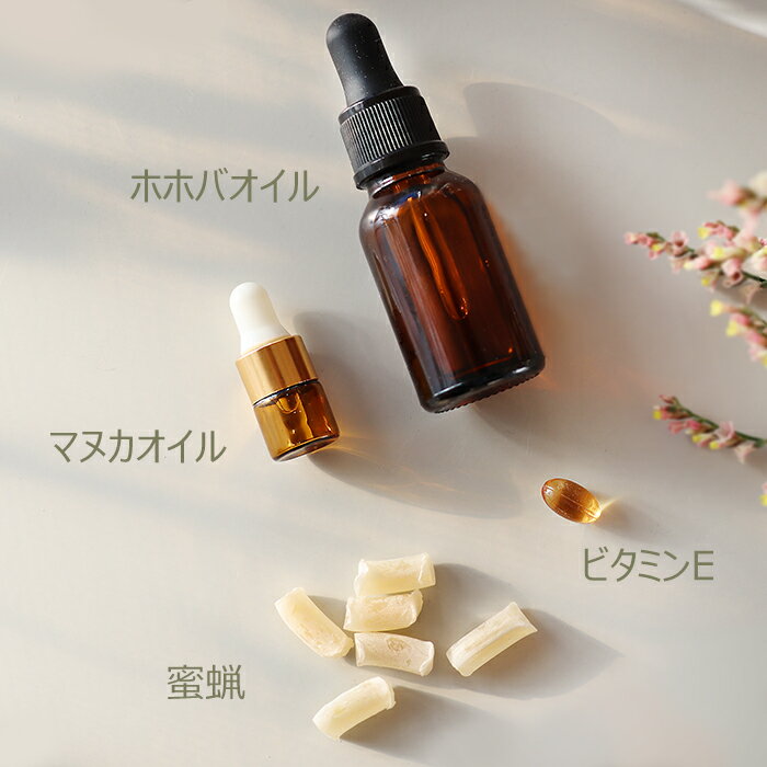 【作り方(簡単3ステップ)】1.溶かす同梱のガラス瓶に蜜蝋とホホバオイルを入れ、湯せんで完全に溶かします。※一度で溶けない場合は、2回に分けて湯せんしてください。2.仕上げる完全に溶けたら湯せんから取り出し、マヌカオイル1滴、ビタミンEを2〜3滴加えてよく混ぜます。3.冷やすそのまま置いて冷ましたら完成です。