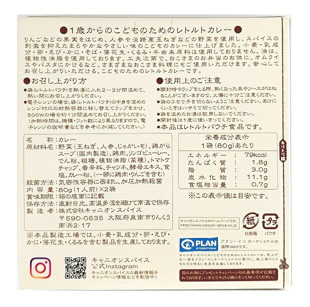 (全国送料無料)キャニオンスパイス こどものためのレトルトカレー 甘口 (小)160g(80g(1人前)×2袋、箱入)(合計2食分)(1歳からの子供カレー 甘口)(レトルト キッズフード お子様カレー)≪ギフト 日時指定不可≫