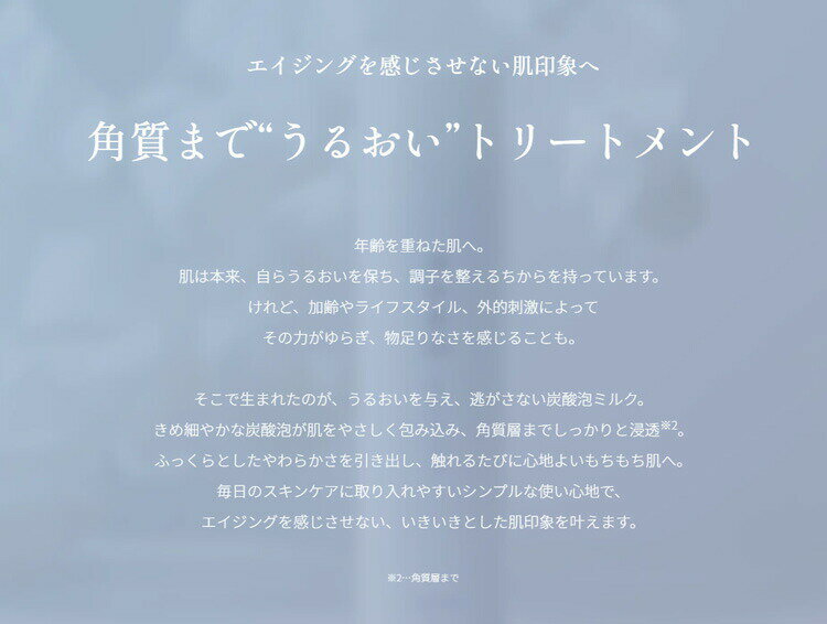 ■炭酸とナノバブルをたっぷり含んだふわとろ泡ミルクと贅沢な美容成分が、お肌をうるおいで満たします! 毛穴より小さいナノバブル炭酸泡がお肌の角質層まで浸透、しっかりとうるおいを与え乾燥からお肌を守ります。