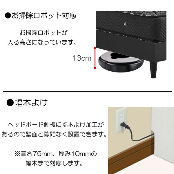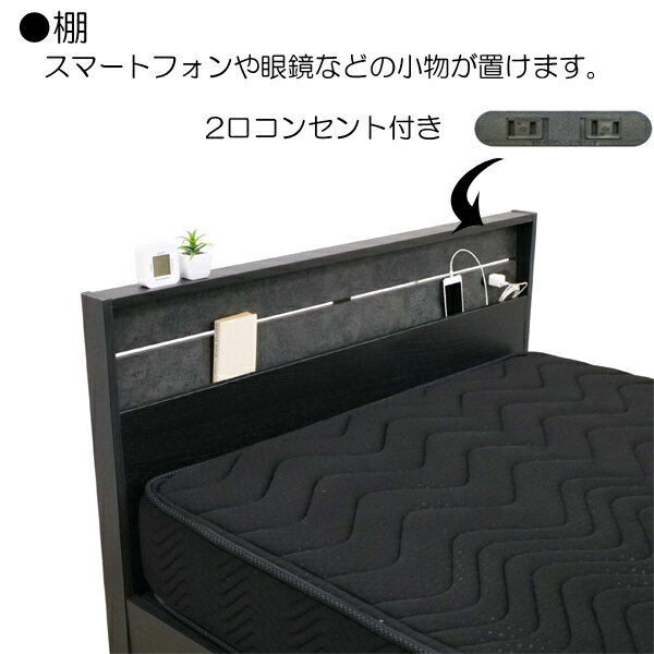 ●POINT ・素材感ある石目模様が高級感と重厚感を演出します。 ・スマートフォンや眼鏡などの小物が置ける棚付き(有効奥行6cm) ・スマートフォン等の充電に便利な2口コンセント付き 埃などが入りにくいスライドカバー仕様 ・ヘッドボード側板に幅木よけ加工があるので壁面と隙間なく設置できます 高さ7.5cm、厚み1cmの幅木まで対応します