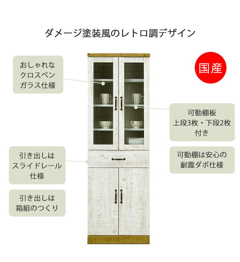 ■商品の特徴 レトロ調のデザインがすてきなキッチン収納。 ダメージ塗装風の強化紙でおしゃれなツートンカラー。 引出しは堅牢な箱組仕上げにスライドレールを使用。 可動式の棚板は耐震ダボ仕様で安心してお使い頂けます。 ガラス扉はクロスペンガラスを採用しよりレトロ感を演出します。