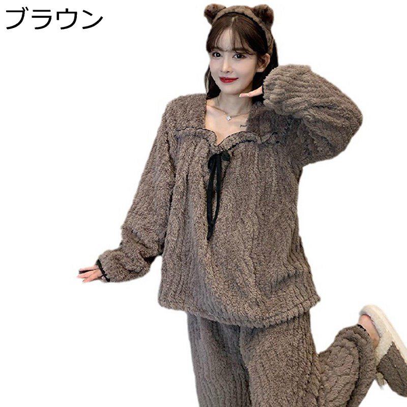 レディース パジャマ リポン もこもこ 5XL ルームウェア 無地 便利服 スクエアネック 暖かい 防寒保温 フランネル 上下セット 前開き 長袖 秋冬向き 長袖トップス キレイめ 部屋着 室内着 可愛い 長袖パジャマ