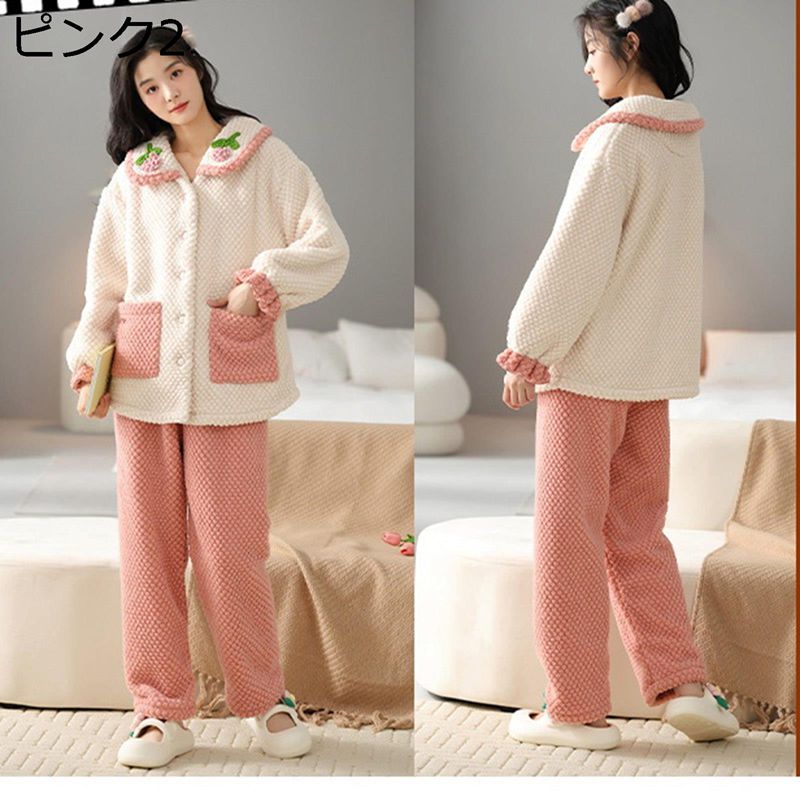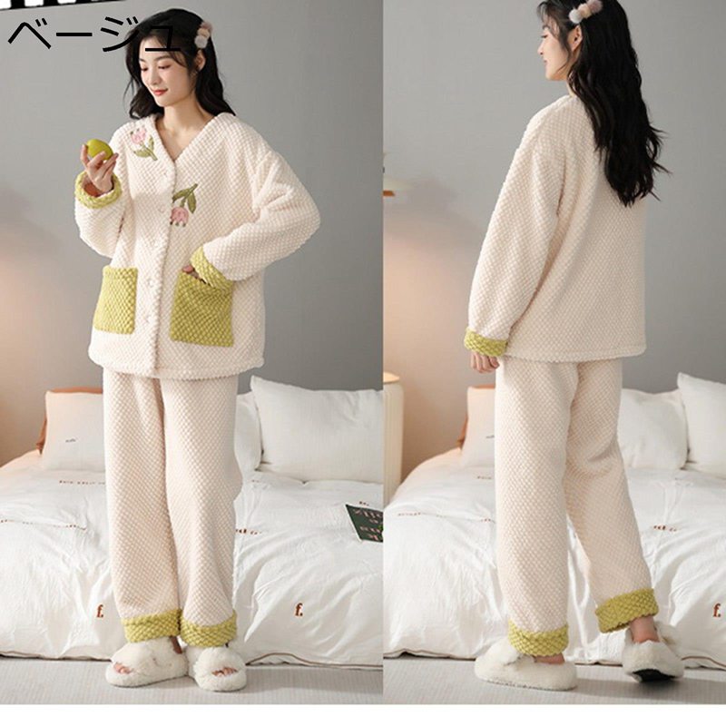 ルームウェア vネック レディース パジャマ 無地 秋冬用 花刺繍 立体的な花 セットアップ フリル フランネル 寝間着 柔らか 保温 耐久性 日系 シンプル 発熱 女性用 誕生日 ギフト 普段着