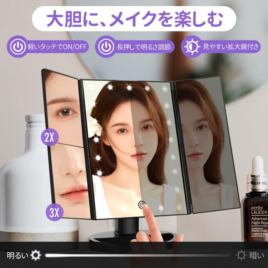 FACSINATE 女優ミラー 三面鏡 卓上鏡 化粧 ledメイク 折りたたみ ライト付き 拡大鏡 2/3倍 タッチ式 明るさ調節 角度調整 収納ペース (ブラック)