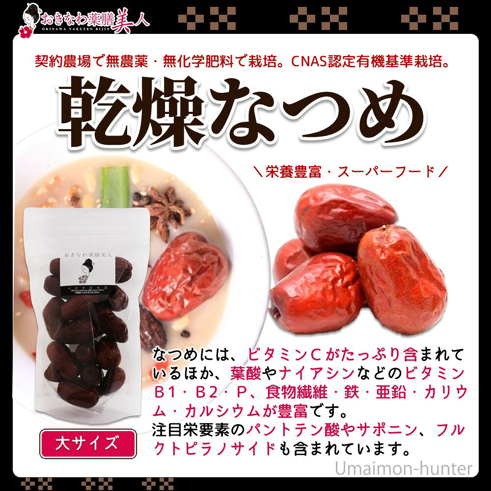 【販売者】株式会社オリーブガーデン(沖縄県国頭郡恩納村) メーカー名 おきなわ薬膳美人 原産国名 中国産 産地直送 沖縄県 商品説明 おきなわ薬膳美人さんのなつめは、契約農場で無農薬、無化学肥料で栽培したなつめで、CNAS認定有機基準栽培です。大粒で食べ応えがあります。ナツメには、ビタミンCが、たっぷり含まれているほか、葉酸やナイアシンなどのビタミンB1・B2・P、食物繊維、鉄、亜鉛、カリウム、カルシウムが豊富です。注目栄要素のパントテン酸やサポニン、フルクトピラノサイドも含まれています。漢方薬の世界でもなつめの成熟させたものは大棗(たいそう)と呼ばれ、高く評価されています。日本薬局方にも収録されており、葛根湯など馴染みのある漢方薬にも配合されています。 中国では、「一日吃三棗、終生不顕老(なつめを1日に3つ食べると老いない)」という言葉があり、多くの漢方薬に使われ「女性の宝果」と呼ばれています。“世界三大美女”として名高い楊貴妃(ようきひ)も欠かさずに食していたと言われています。まさにスーパーフードです。 安全上のお知らせ ※当サイトの商品情報は、お客様が商品を選ぶ際に参考にしていただくためのものであり、医師や薬剤師およびその他の資格をもった専門家の意見に代わるものではありません。※ご使用前には必ずお届けの商品ラベルや注意書きをご確認ください。※この商品情報は病気を治すための自己診断に使うことはできません。※アレルギー体質の方や妊婦の方などは、かかりつけの医師にご相談のうえご購入ください。宅急便:常温着日指定:〇可能 ギフト:×不可 ※生産者より産地直送のため、他商品と同梱できません。※納品書・領収書は同梱できません。 領収書発行は注文履歴ページから行えます。 こちらの商品は全国送料無料です