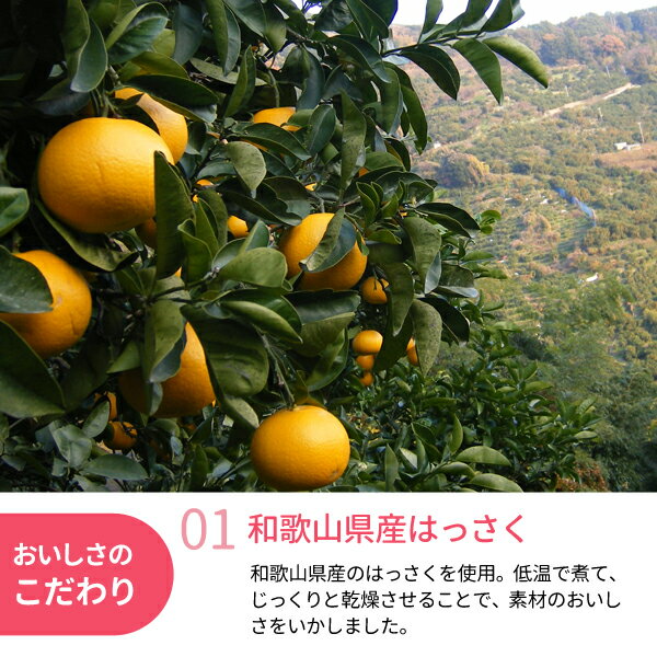 ●紀州産ドライフルーツ はっさく 和歌山県紀州産素材使用。低温で煮ることで素材の美味しさをいかしました。じっくりと乾燥させたひとくちサイズのやわらか食感が人気の商品となっております。