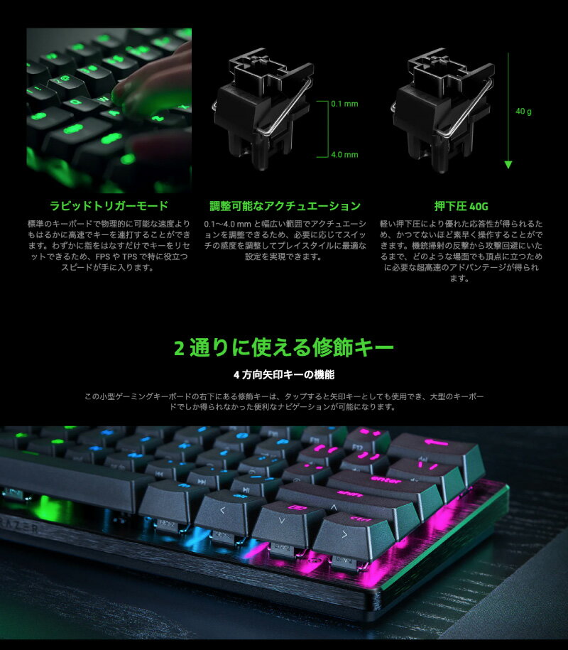 ■ 第2世代 RAZERTM アナログオプティカルスイッチ超高速連打を可能にするラピッドトリガー、0.1~4.0 mmの範囲で調整可能なアクチュエーション、1億回のキーストローク寿命を備えたRazerの最も高度なスイッチを搭載したe スポーツキーボードで、最高の精度と応答性が得られます。