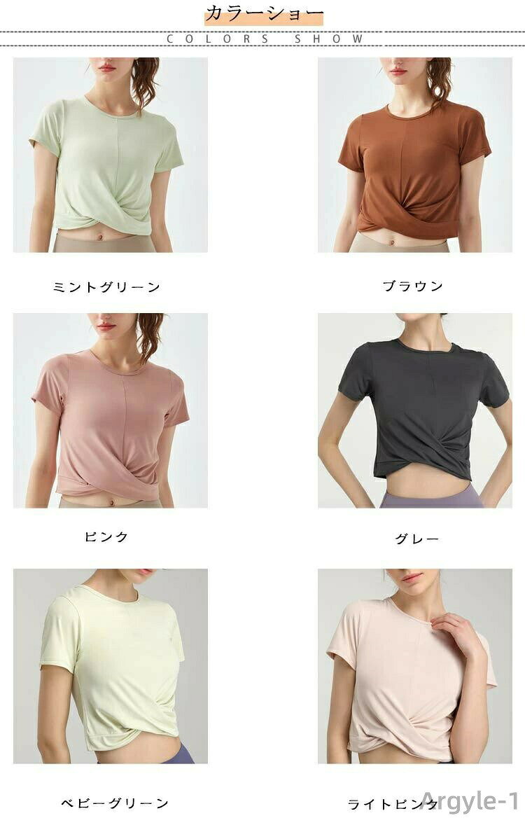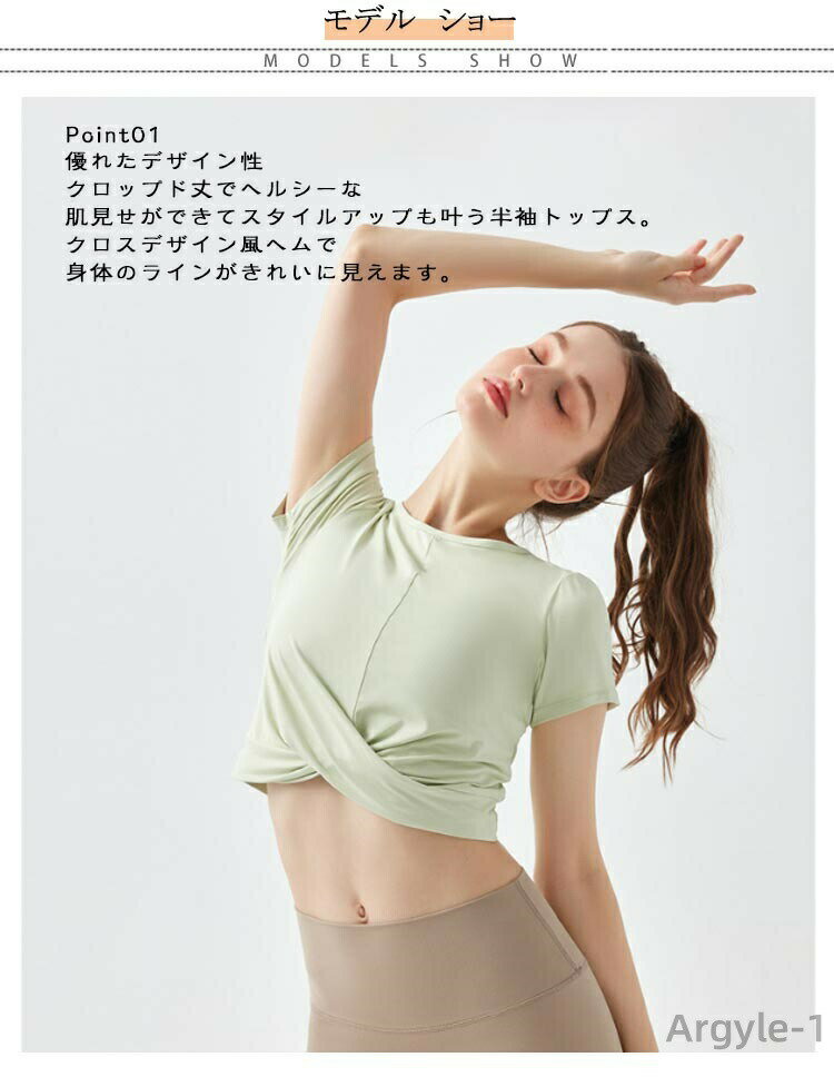 ヘルシーに肌見せ「クロップド丈ヨガトップス」Point01優れたデザイン性クロップド丈でヘルシーな肌見せができてスタイルアップも叶う半袖トップス。クロスデザイン風ヘムで身体のラインがきれいに見えます。Point02速乾素材を採用吸水性、速乾性に優れ、さらりとした質感で気持ちのよい着心地。汗による肌へのべたつきを軽減し、運動中の体も快適でドライな状態に◎Point03伸縮性たっぷりでストレスフリーストレッチ性のある生地を使用しているので、動きやすく様々なポーズに対応。Point04シンプルで使いやすい淡めカラーどんなものに合わせても、合わせやすいシンプルなカラバリが揃ってる!ヨガやフィットネスでのコーデのバリエーションも広がってGOOD! サイズ S M L XL 2XL サイズについての説明 ※上記サイズは平置き実寸になります。サイズ表の実寸法は商品によって1-3cm程度の誤差がある場合がございます。(単位:cm) 素材 ポリエステル、ポリウレタン 色 ミントグリーン ブラウン ピンク グレー ベビーグリーン ライトピンク 備考