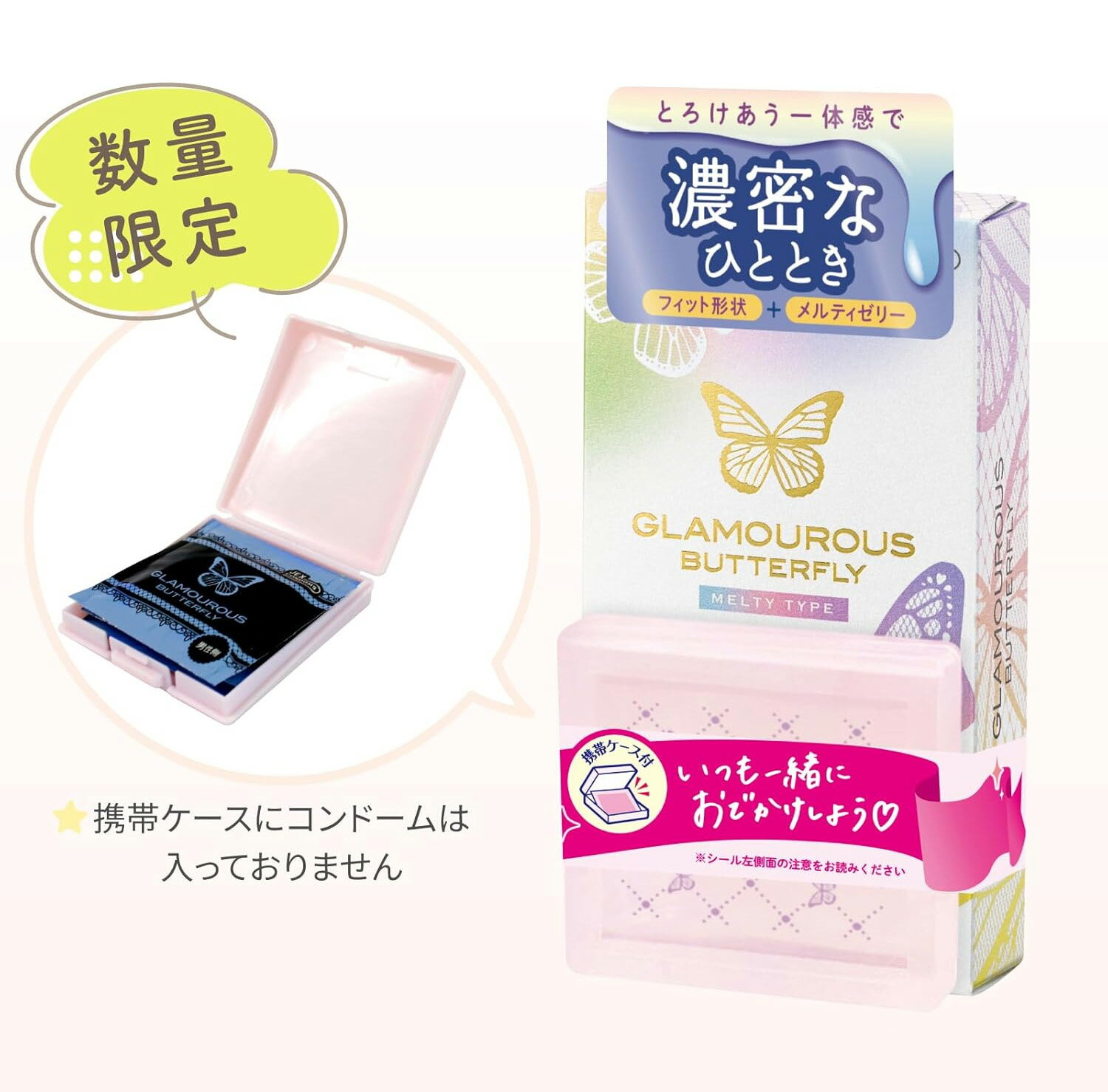 【バタフライ メルティ(10個入り)】 ・特徴 とろけるような一体感:“メルティゼリー”付き。 独自開発の「メルティゼリー」が先端にたっぷり含まれており、滑らかで濃密な感触が楽しめます。 締め付けないフィット形状のラテックス素材。 柔らかく体に優しくフィットし、自然な装着感を提供します。 女性側にも優しいジェルトップ加工。 厚みのある潤滑ゼリーが先端部に固定されており、スムーズな挿入と快適さを両立させる構造です 。 濃厚な潤滑感を追求。 水溶性ゼリーをたっぷり配合し、滑らかな使用感を実現しています。 かわいいピンクカラー & 日本製。 パッケージや本体のカラーも女性に好まれるデザインで、安心の日本製です(医療機器承認取得済 第227AKBZX00001000号)。 医療機器認証番号、第227AKBZX00001000号。