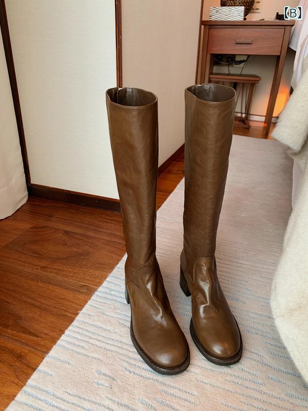 ブーツ スタイリッシュ バックジッパー ヴィンテージ加工 ソフトレザー ファッション スリム チャンキーヒール ロング ライダー 靴