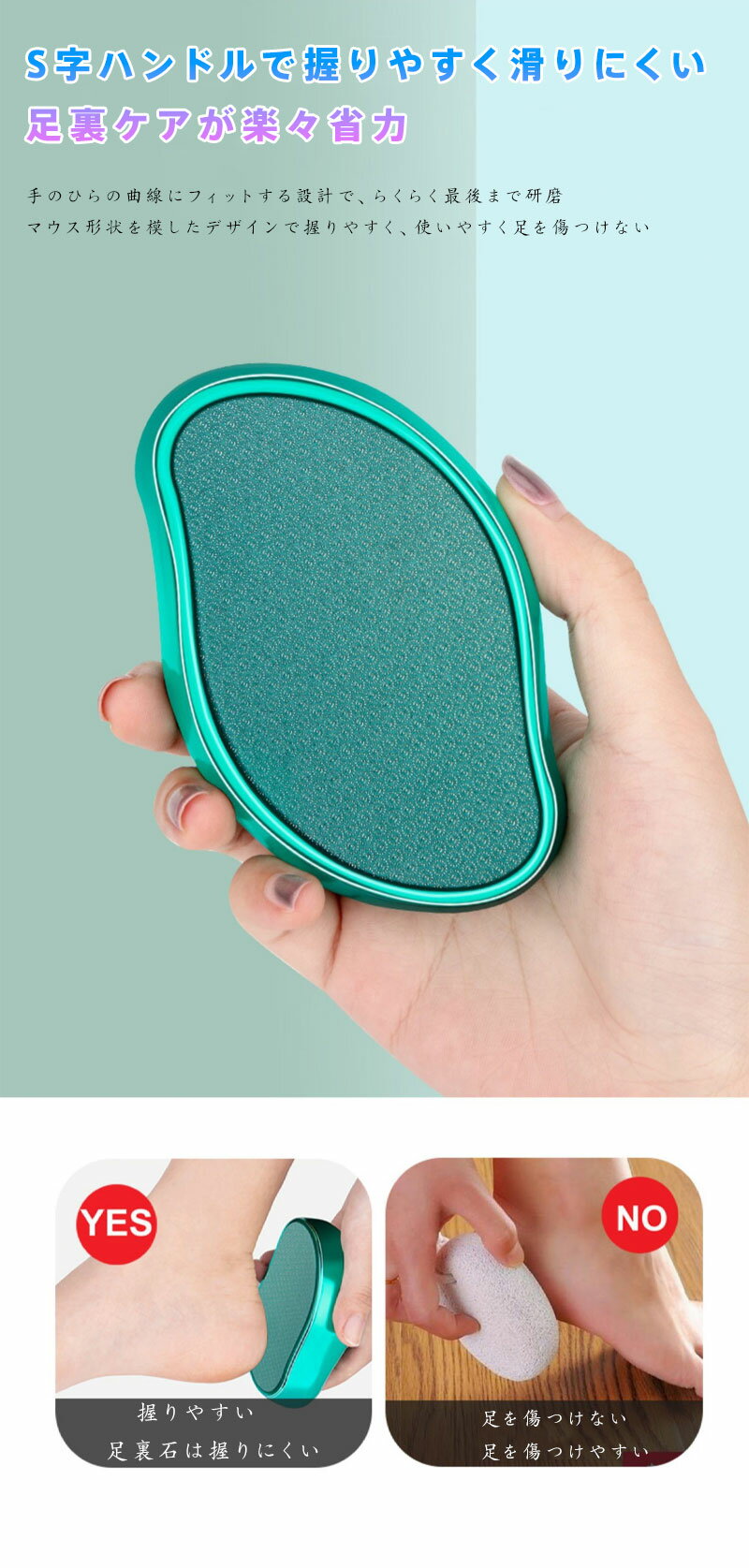 【特徴】 1. 驚きの使い心地: 鋭利すぎず、肌を傷つけにくいナノガラス研磨面で、一度でつるつるの足裏を実現。硬い角質やタコ、水虫によるガサガサした肌のケアに最適です。 2. 握りやすさと安全性: 手のひらの曲線にフィットするS字ハンドルで、力を入れやすく、滑りにくい設計。従来の足裏石より楽に、最後までラクに研磨できます。 3. 驚くほど清潔でお手入れ簡単: 水で流すだけで汚れを落とせ、細菌の繁殖を防ぎます。水に強く錆びないので、衛生的でメンテナンスも不要。電動製品とは違う手軽さが魅力です。 4. コンパクトで携帯に便利: 軽量で薄型のため、カバンやポーチにすっぽり収まり、旅行や銭湯、スポーツジムなどへの持ち運びに便利です。 5. 足も手も両方使える: 足裏の角質除去はもちろん、手の肘やかかとの集中的なケアにもお使いいただけます。ご家族皆様で共用できる優れものです。 6. 高級感のあるデザイン: メッキ加工が施された外装は高級感があり、洗面所に置いてもおしゃれ。自分用はもちろん、大切な方へのギフトとしても喜ばれます。