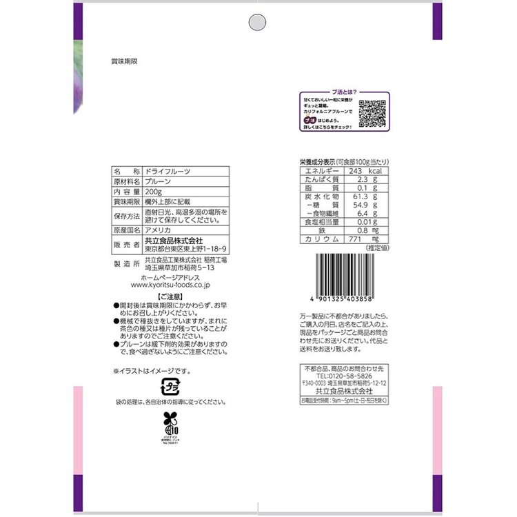 ●成分熱量(kcal)243 たんぱく質(g)2.3 脂質(g)0.1 炭水化物(g)61.3 食塩相当量(g)0.01 ナトリウム(mg)0(検索用:プルーン ドライフルーツ 個包装 ソフトタイプ 種ぬき 保存料無添加 プ活 アメリカ産 腸活 砂糖不使用 4901325403858) 関連キーワード(本商品の説明ではありません)母の日 父の日 敬老の日 こどもの日 クリスマス バレンタイン ホワイトデー ハロウィン お正月 成人の日 成人式 記念日 誕生日 卒業式 入学式 お歳暮 お中元 春 夏 秋 冬 梅雨 節分 ひな祭り 七夕 十五夜 初詣 年越し 夏祭り 花火大会 結婚祝い 内祝い 出産祝い 快気祝い 還暦祝い 古希 喜寿 傘寿 米寿 卒寿 白寿 百寿 新築祝い 引っ越し祝い 開店祝い 開業祝い 就職祝い 昇進祝い 合格祝い 銀婚式 金婚式 七五三 長寿祝い 御礼 お母さん お父さん 義母 義父 祖父 祖母 おばあちゃん おじいちゃん 娘 息子 彼氏 彼女 恋人 友達 上司 先輩 後輩 同僚 キッズ 子供 幼児 ベビー 赤ちゃん 育児 学生 社会人 シニア 10代 20代 30代 40代 50代 60代 70代 80代 90代 一人暮らし 単身赴任 主婦 主夫 新生活 家族暮らし 子育て 旅行 トラベル ライブ ホームパーティ ビジネス 法人 ギフト プレゼント 最強翌日配送対象商品に関するご案内 最強翌日配送対象商品・対象地域に該当する場合は最強翌日配送マークがご注文カゴ近くに表示されます。 最強翌日配送可能なお支払方法は