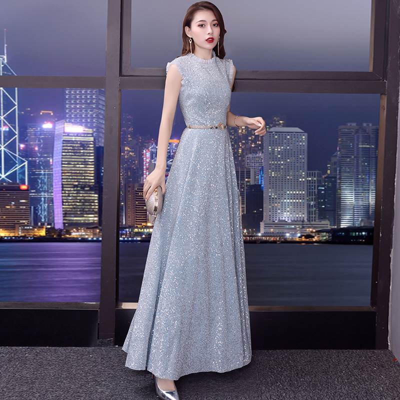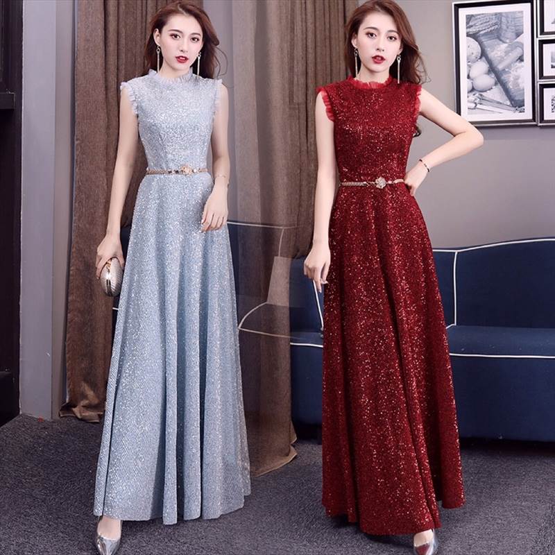 【P2倍&クーポン有】オケージョンドレス マキシ丈 ドレス ノースリーブ ワンピドレス オールシーズン 袖なし 腕出し スタンドカラー 半ハイネック フレア Aライン フリル ベルト ブルー 青 シルバー 光沢 キラキラ 無地 ラメ S M L XL LL ポリエステル パーティー 式典