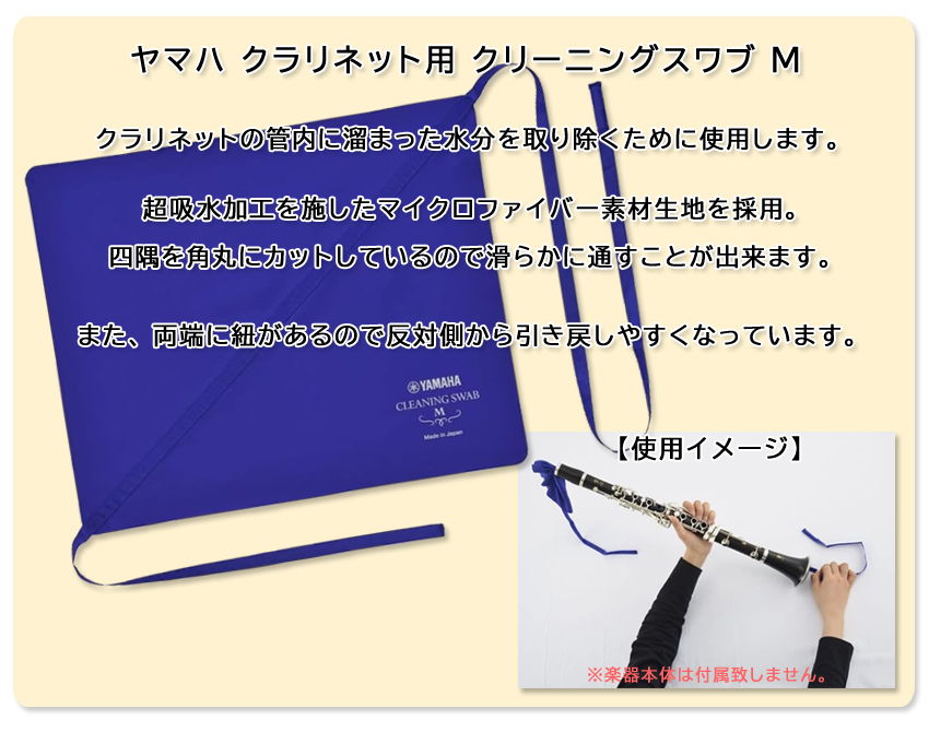 【ヤマハ:クラリネット用 クリーニングスワブ】 クラリネットの管内に溜まった水分を取り除く際に使います。 スワブについている片方の紐を管体に通し、反対側から出てきた紐を引っ張ってスワブを抜き取る、 この作業を1つの管に対して2~3回程度繰り返します。(あまり勢いは付けず、ゆっくり行いましょう。) 練習後のお手入れだけでなく、練習中や演奏中に水分が溜まったと感じる際などにも使用します。 本品は両端に紐が付いているので、初心者の方でも反対側からスワブを引き抜きやすくなっています。 なお、本品はEb、Bb、Aクラリネット、アルトクラリネットと、幅広い機種にご使用頂くことができます。 ※スワブはしっかり広げて紐に玉結びが出来てしまっていないかよく確認してから使用して下さい。(管内の突起に引っかかる可能性があります。) ※スワブを通す際は、バレル(マウスピースを取り付けるところ)、上管、下管、ベルを分解してから使用して下さい。 ※スワブが詰まってしまった際は無理に取り除かず、お近くの楽器屋さんやリペア工房にお持ち込み下さい。
