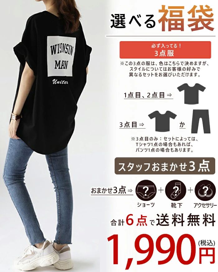 靴下 ボトムス トップス おまかせ 送料無料 謎 シークレット 新作 tシャツ+tシャツ+パンツ+ショーツ+靴下+アクセサリー6点セット