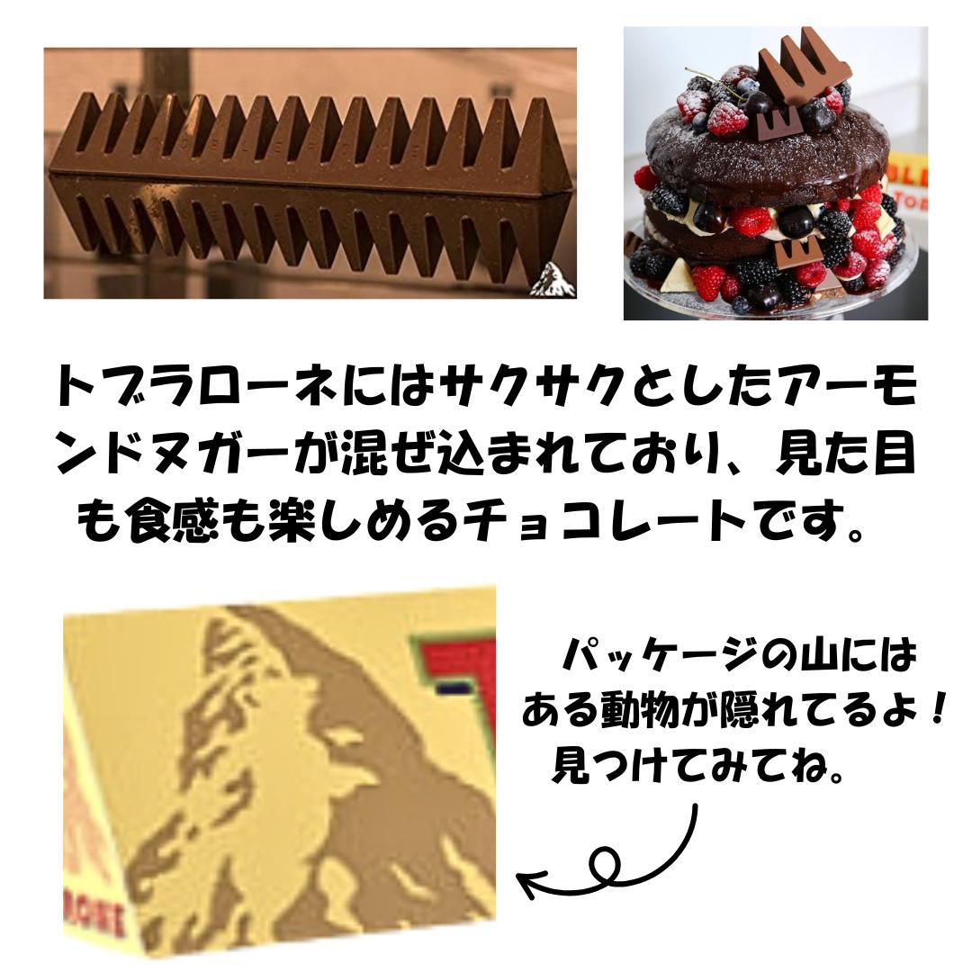 内容量:35g×8個 マッターホルンをかたどったユニークな三角形のハチミツヌガー入りのチョコレートで、旅行のお土産やギフトとして高い支持を得ています。 アルプスの名峰・マッターホルンからインスピレーションを得たと言われる、ユニークな形の「トブラローネ」のチョコレート。 ミルク・アーモンド・ヌガー・ハニーが入ったレシピは非常にユニークで、免税店のチョコレート部門の売り上げでNo. 1(モンデリーズ社調べ)を誇り、旅行のお土産やギフトとして高い支持を得ています。