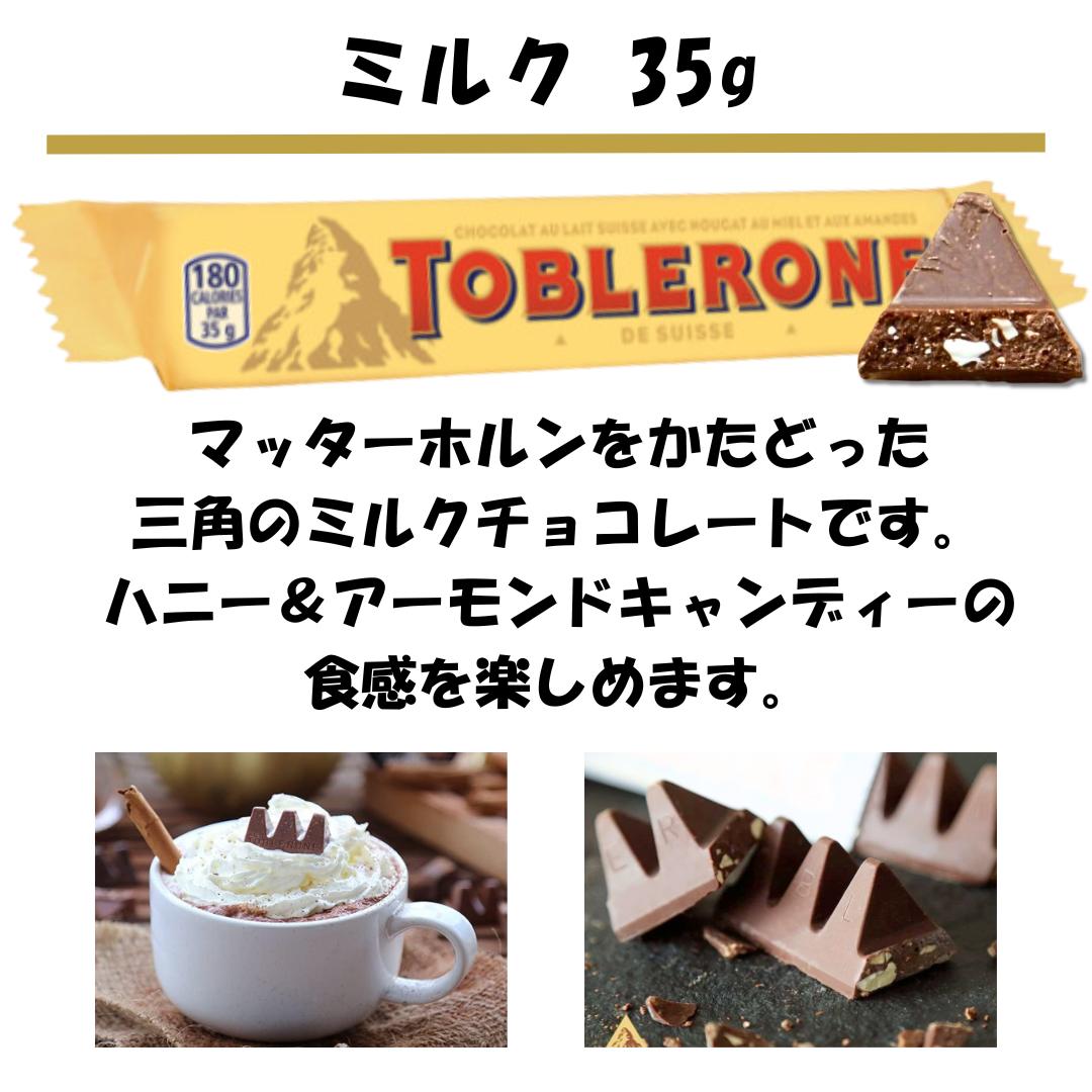【トブラローネ ミルク 35g】 マッターホルンをかたどった三角のミルクチョコレートです。ハニー&アーモンドキャンディーの食感を楽しめます。内容量:35g×8個 マッターホルンをかたどったユニークな三角形のハチミツヌガー入りのチョコレートで、旅行のお土産やギフトとして高い支持を得ています。 アルプスの名峰・マッターホルンからインスピレーションを得たと言われる、ユニークな形の「トブラローネ」のチョコレート。 ミルク・アーモンド・ヌガー・ハニーが入ったレシピは非常にユニークで、免税店のチョコレート部門の売り上げでNo. 1(モンデリーズ社調べ)を誇り、旅行のお土産やギフトとして高い支持を得ています。